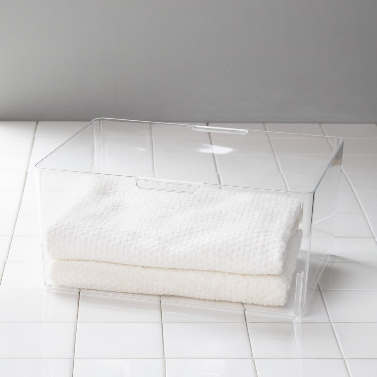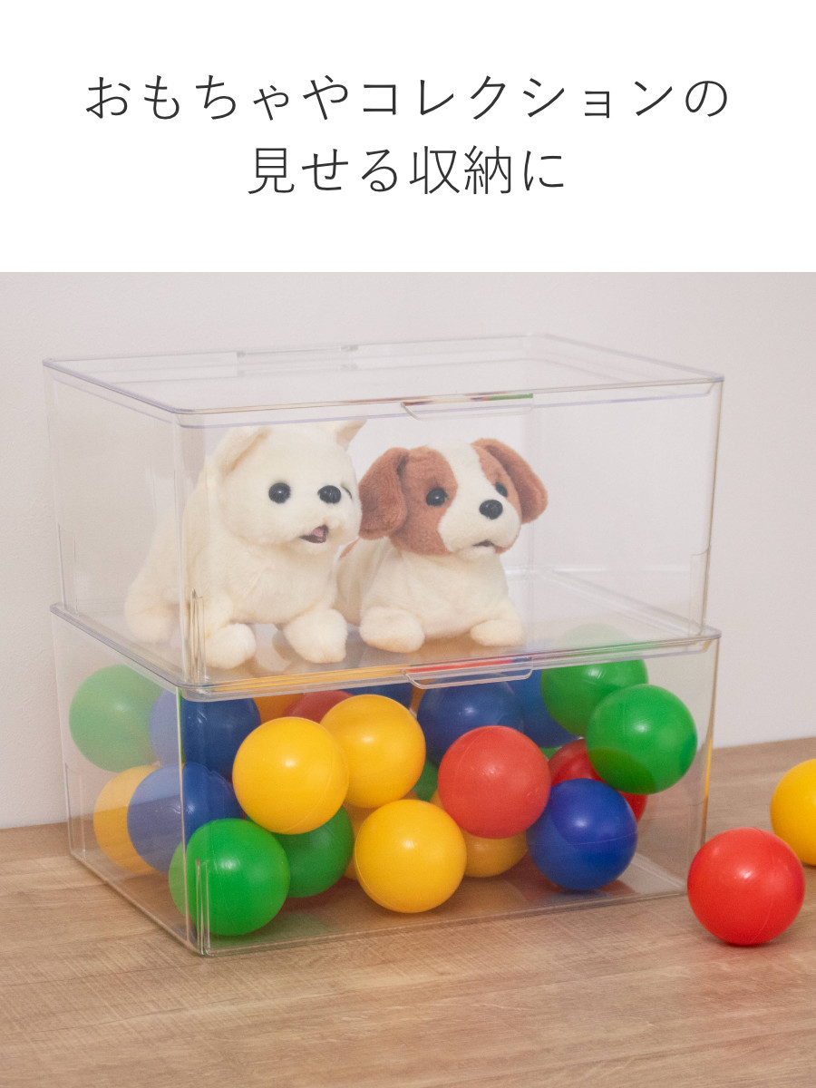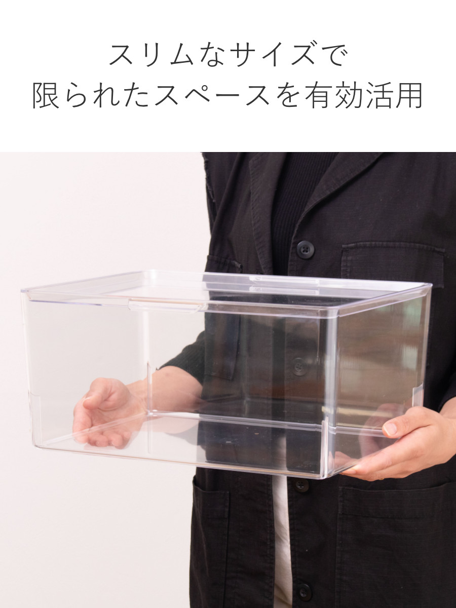 透明度が高い美しいフォルムが特徴の収納ボックスです。中身がひと目で確認できるので、ストック食材や洗剤、コスメ、おもちゃまで、何がどこにあるかラクに把握できます。探さない収納にしておくと、買いすぎ防止や時短にもつながって便利です。