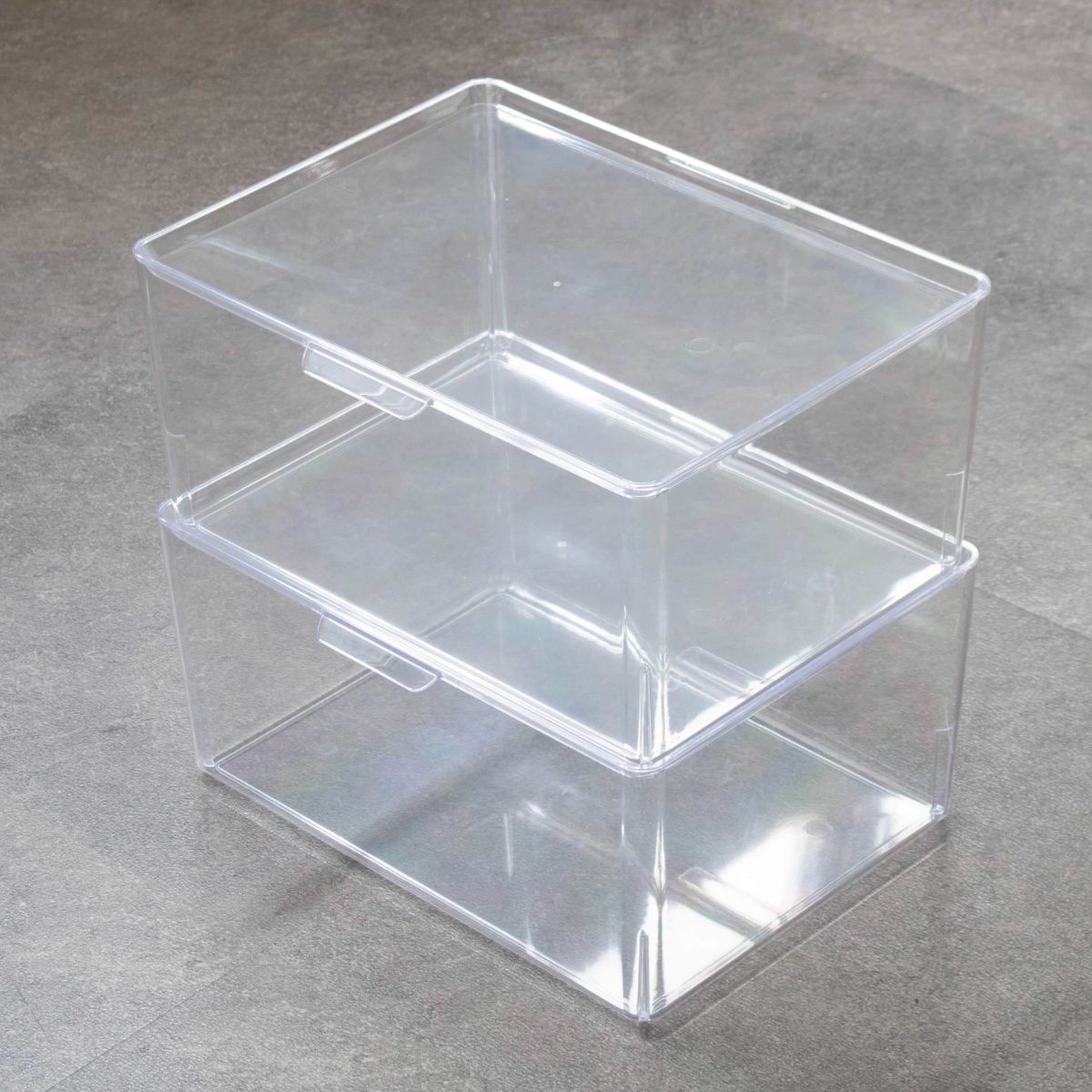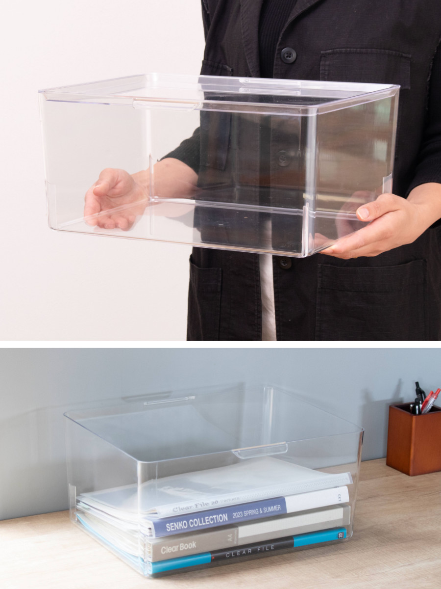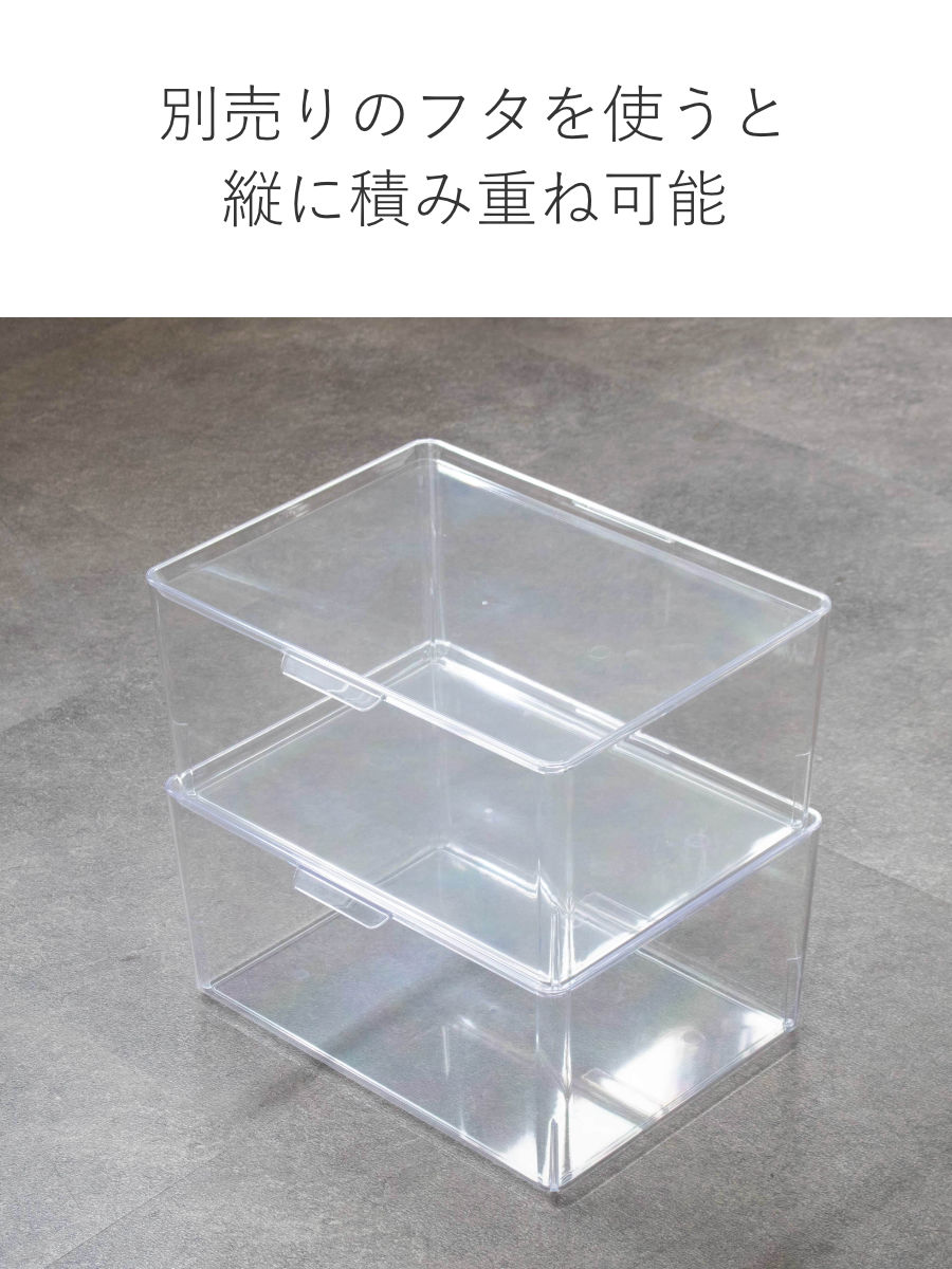 別売りのフタを使うと、ホコリを防ぎながら、縦に重ねて省スペース収納が可能。同じサイズ同士や、サイズ違いのボックスも安定して収納ができます。