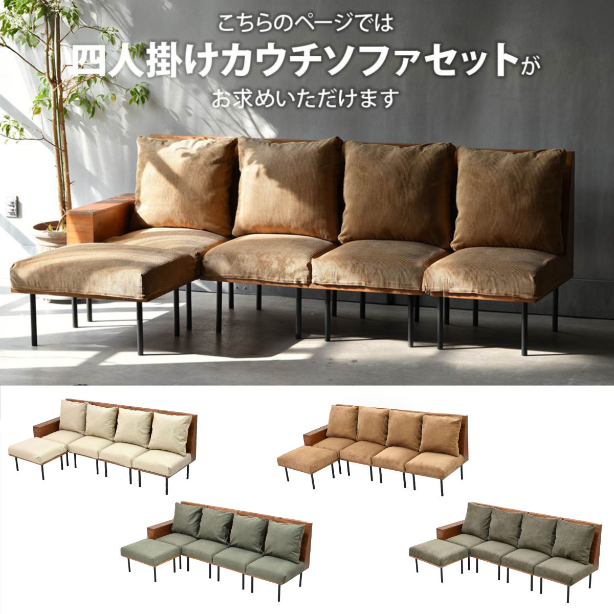 1人掛けソファ3脚、収納付き肘掛けソファ1脚、オットマンの5点セット。連結金具で連結することで手軽にカウチソファに。オットマンをスツール代わりに、2脚+2脚の対面レイアウトでも、単独でもお使いいただけます。ロータイプの脚に付け替えることも可能です。