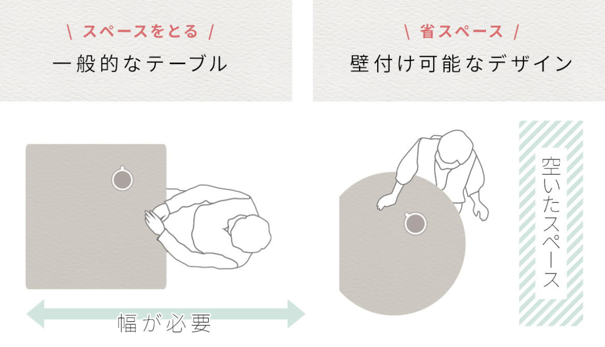 円型デザインのテーブルは壁付けしにくく、スクエア型のデザインは斜めに座ることができずに幅をとりますが、このカフェテーブルならピッタリ壁付けできて省スペースに設置できます。新しくテーブルを置くスペースに余裕がないお部屋でも手軽に置けるので魅力的です。