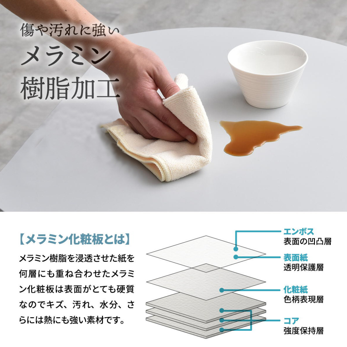 天板はキズや水汚れに強いメラミン樹脂加工を施しています。サラッとした手触りで、お手入れもしやすいです。