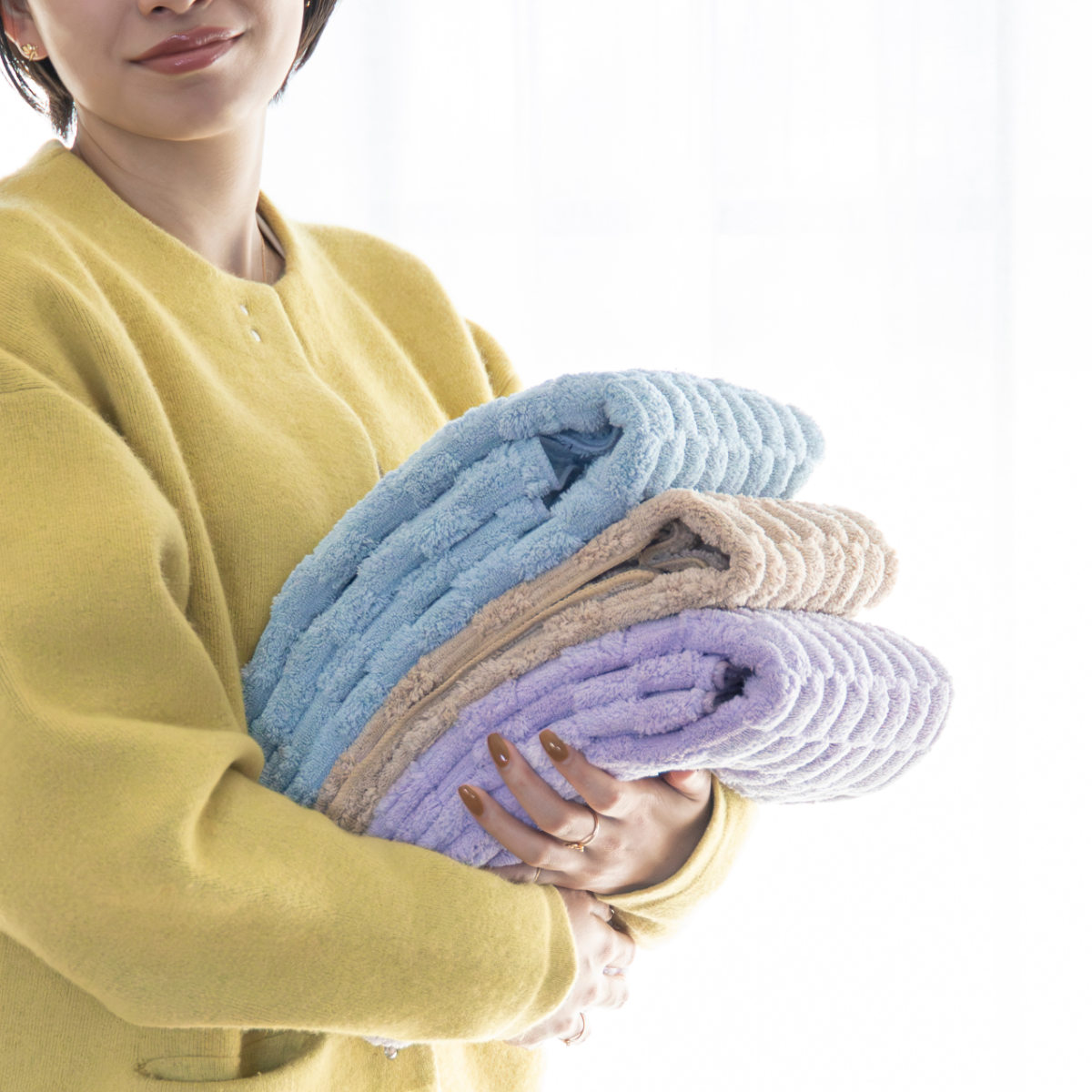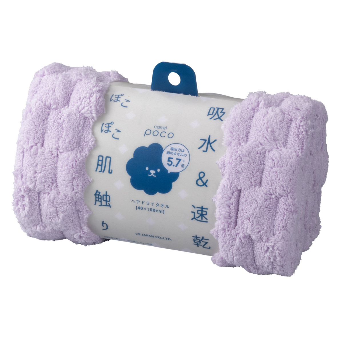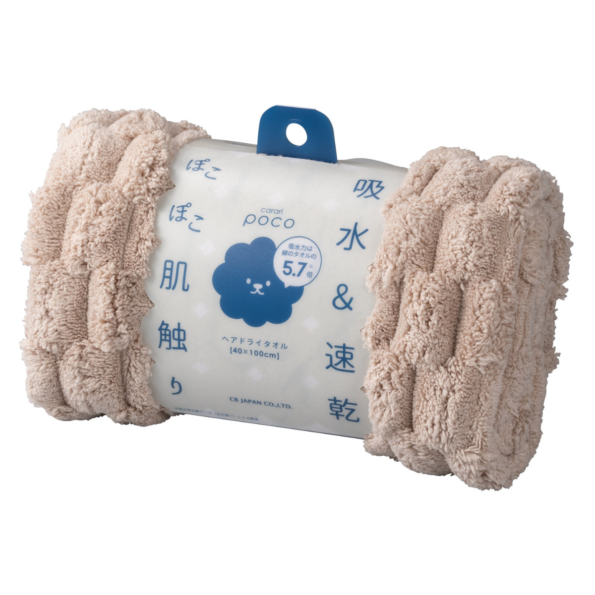 ふんわり軽いのに、驚くほどの吸水力で、繊維と繊維の隙間でまるでスポンジのように吸水してくれます。さらにポコポコの立体構造で触れる面積が多いので、髪の毛に巻いてヘアドライにも大活躍です。
