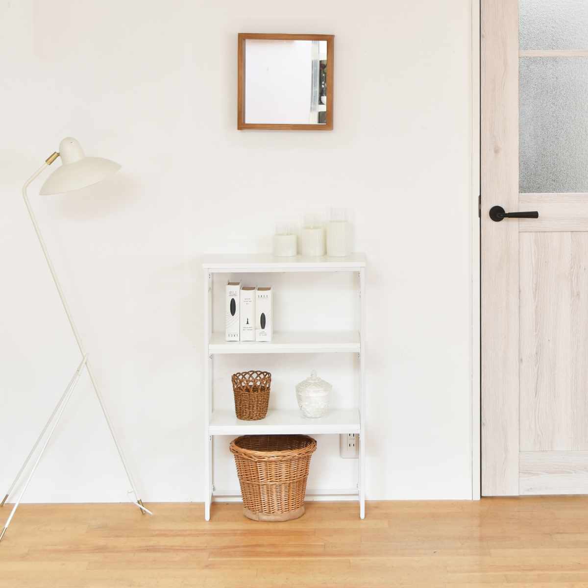 収納物に合わせて高さを調節できる可動棚が付いています。小物や本の収納はもちろん、足元のスペースを活用して、ゴミ箱やストック用品も置くことができます。棚板の位置を変えるだけでコンソールテーブルにもオープンシェルフにもなり、お好みのスタイルでお使いいただけます。