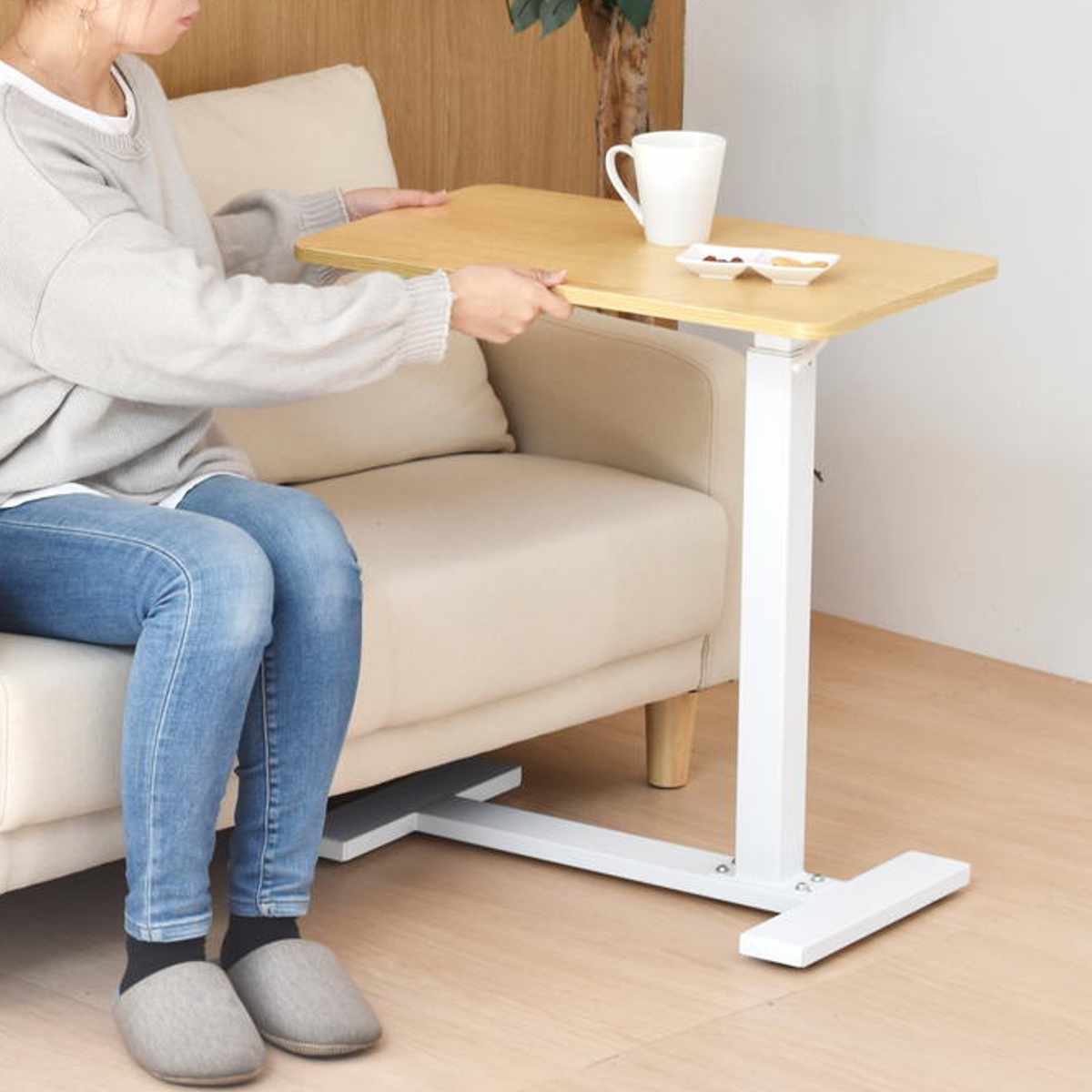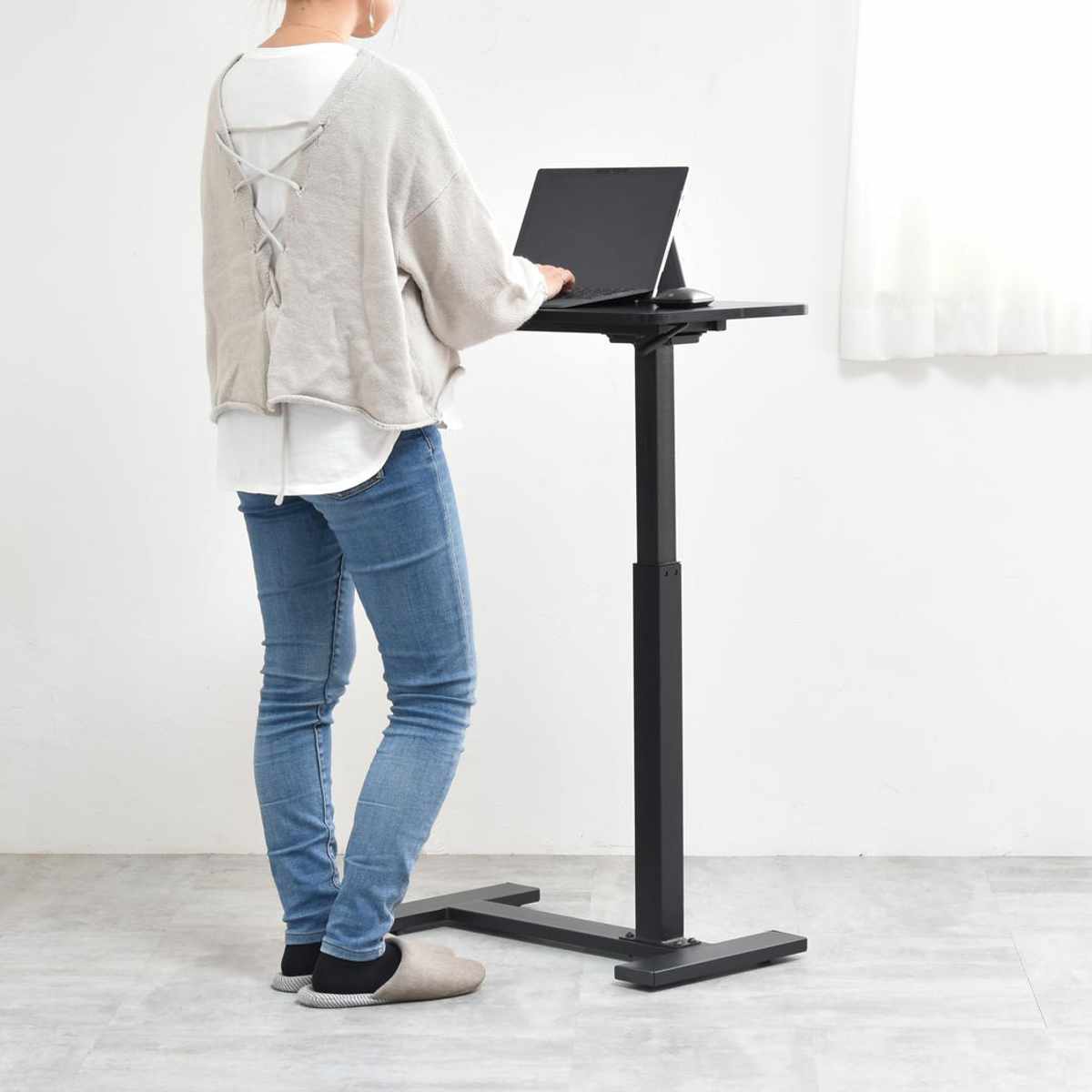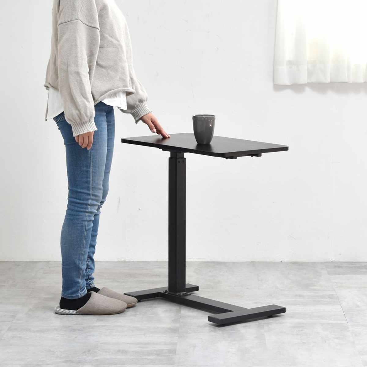 自由に高さを調節できる昇降機能が付いたサイドテーブルです。レバーを押すだけで、63.5~91cmの間を無段階で調整可能。高さを上げれば立ち作業もできるため、座りっぱなしで体に負担がかかりやすいデスクワークやリモートワークにもおすすめです。
