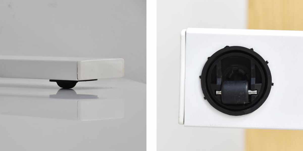 360度回転するキャスターが付いているので、座ったままでもスムーズに移動できます。キャスターは見えにくいデザインのため、脚元がスッキリとしていて、インテリア性も損ないません。