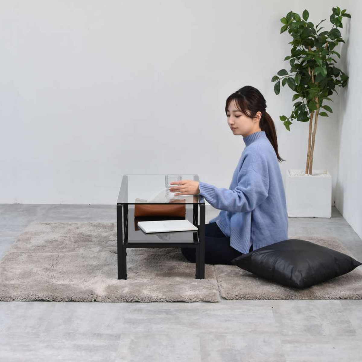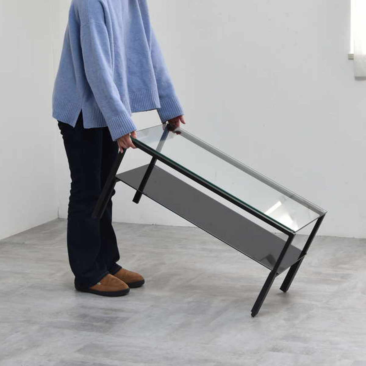 天板と棚板に強化ガラスを使用したセンターテーブルです。透明な天板が圧迫感を軽減し、裏面にカラーを入れたガラスの棚板が空間にアクセントを加えます。マットな質感のアイアンフレームとガラスの艶やかさが調和し、モダンで洗練された雰囲気を演出。透け感のあるデザインで、幅広いインテリアにマッチします。
