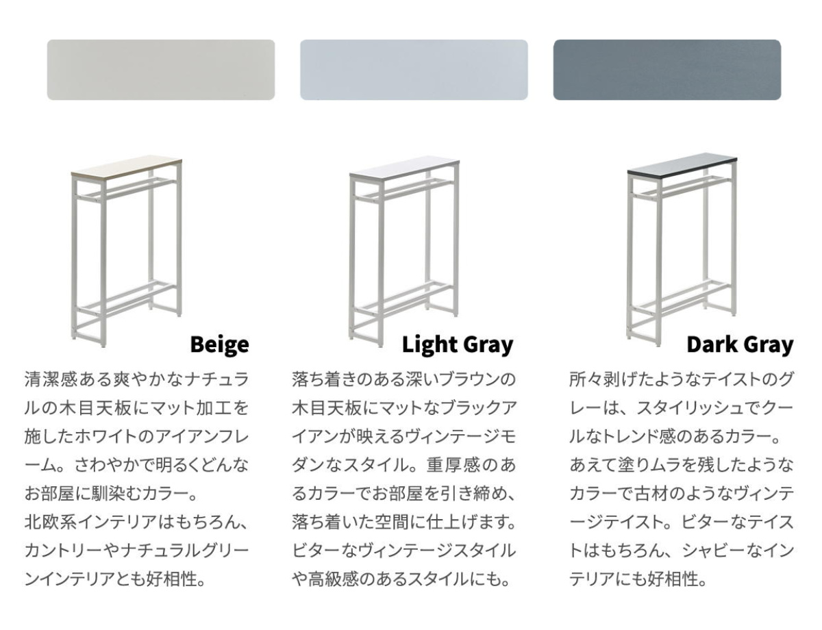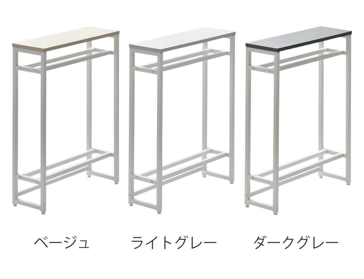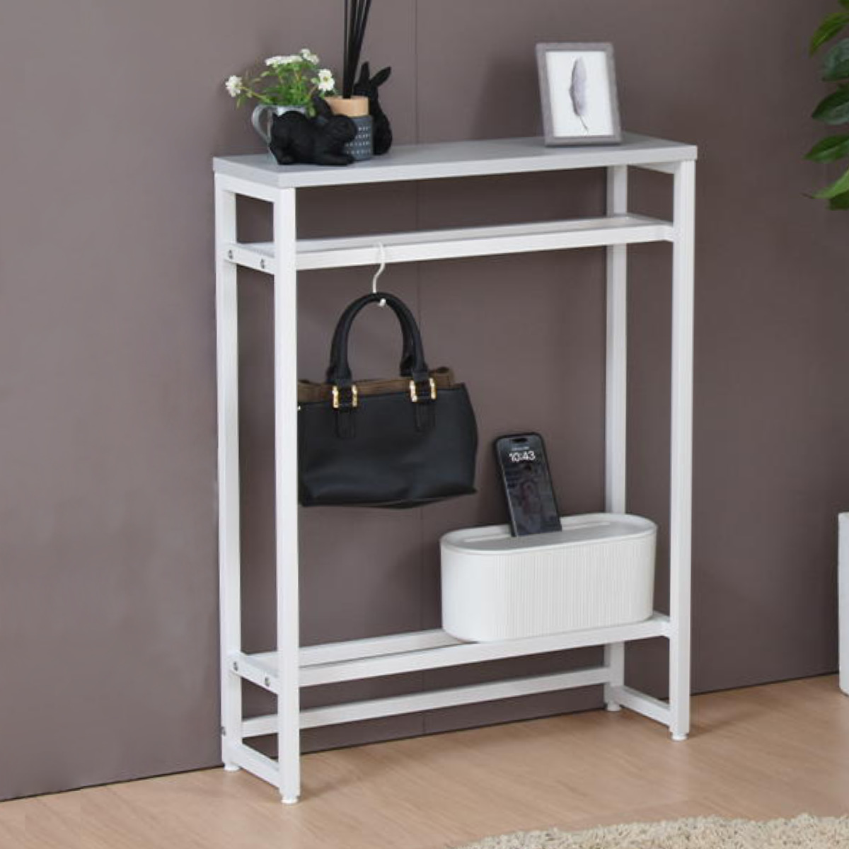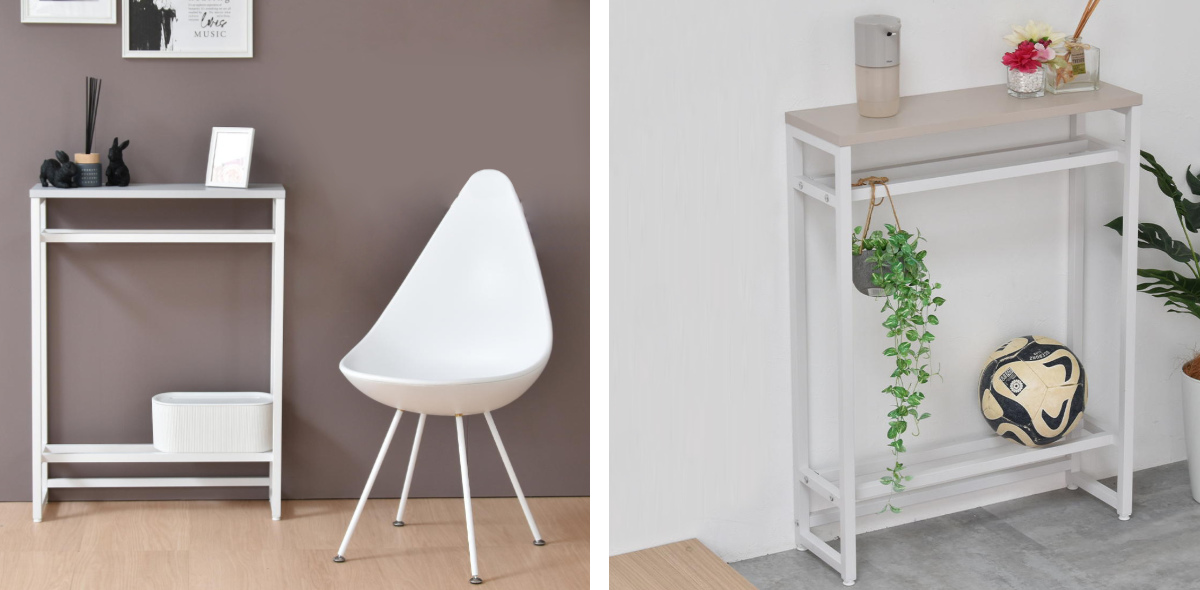 空間を引き締める玄関の小物収納棚や飾り棚になるコンソールテーブルです。マットな質感のメラミン天板とホワイトスチールの細いアイアンフレームだけで構成されたスタイリッシュな美しいデザインです。