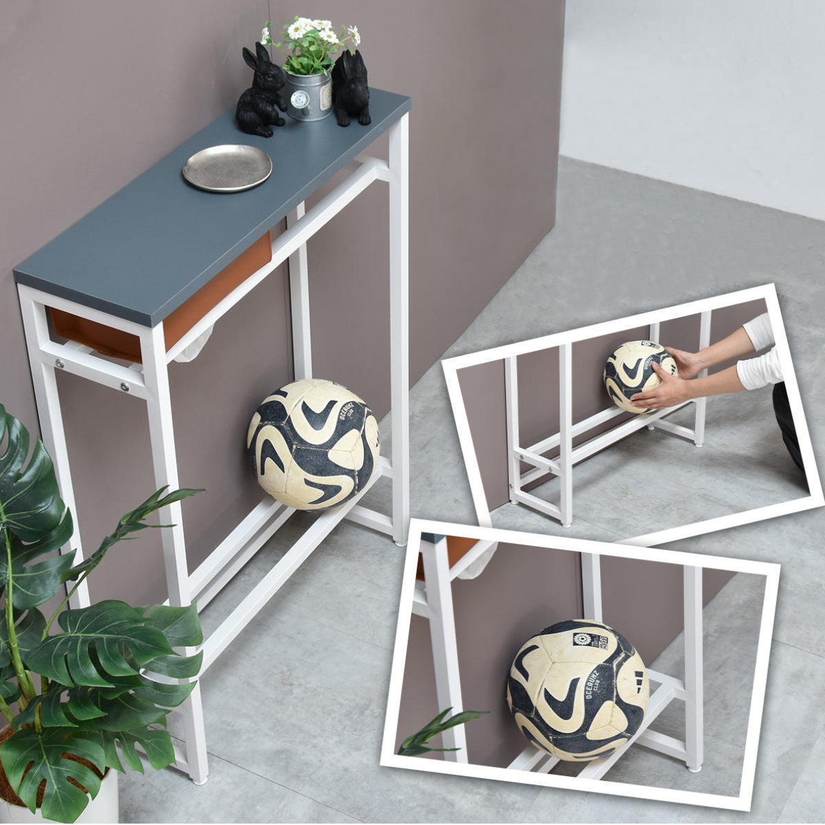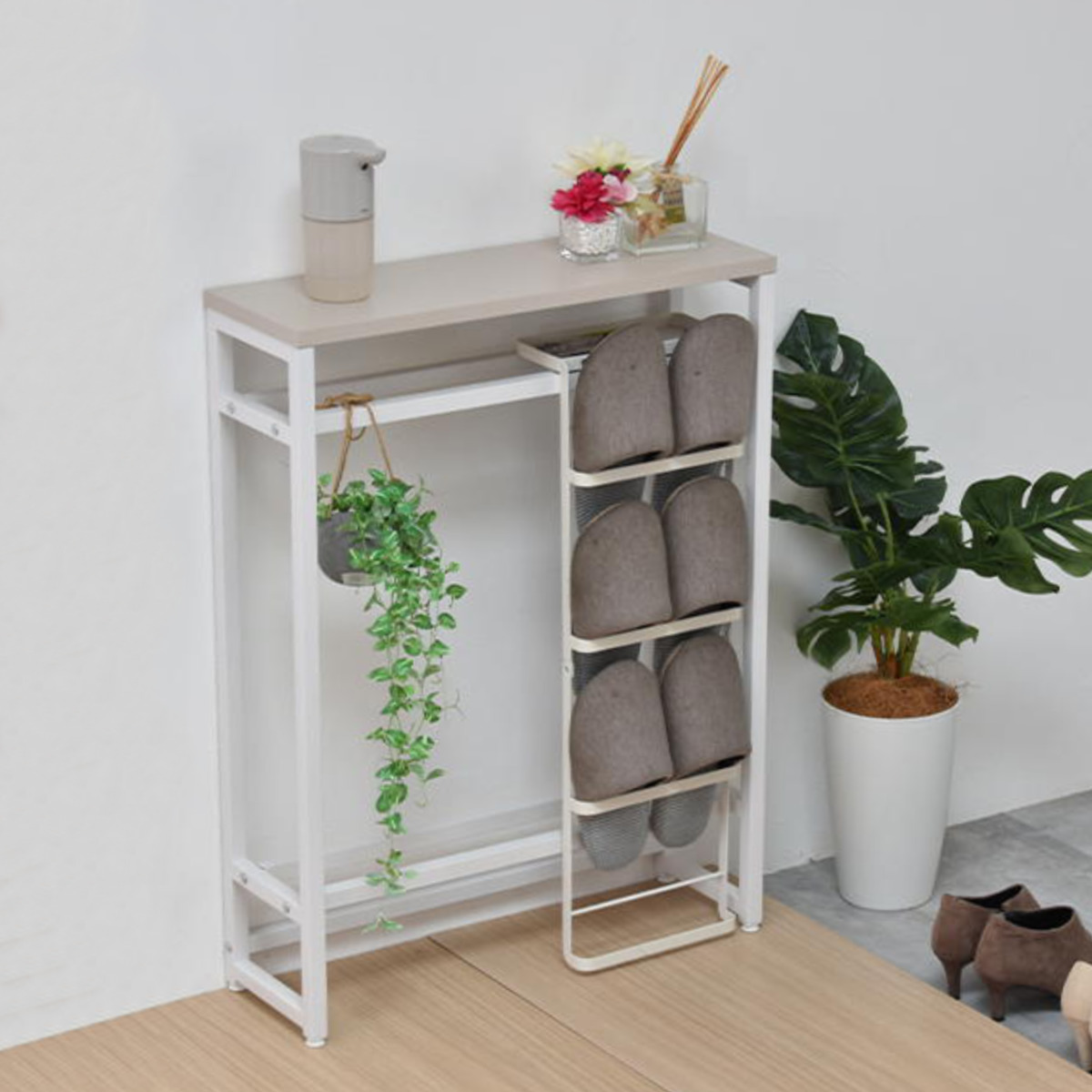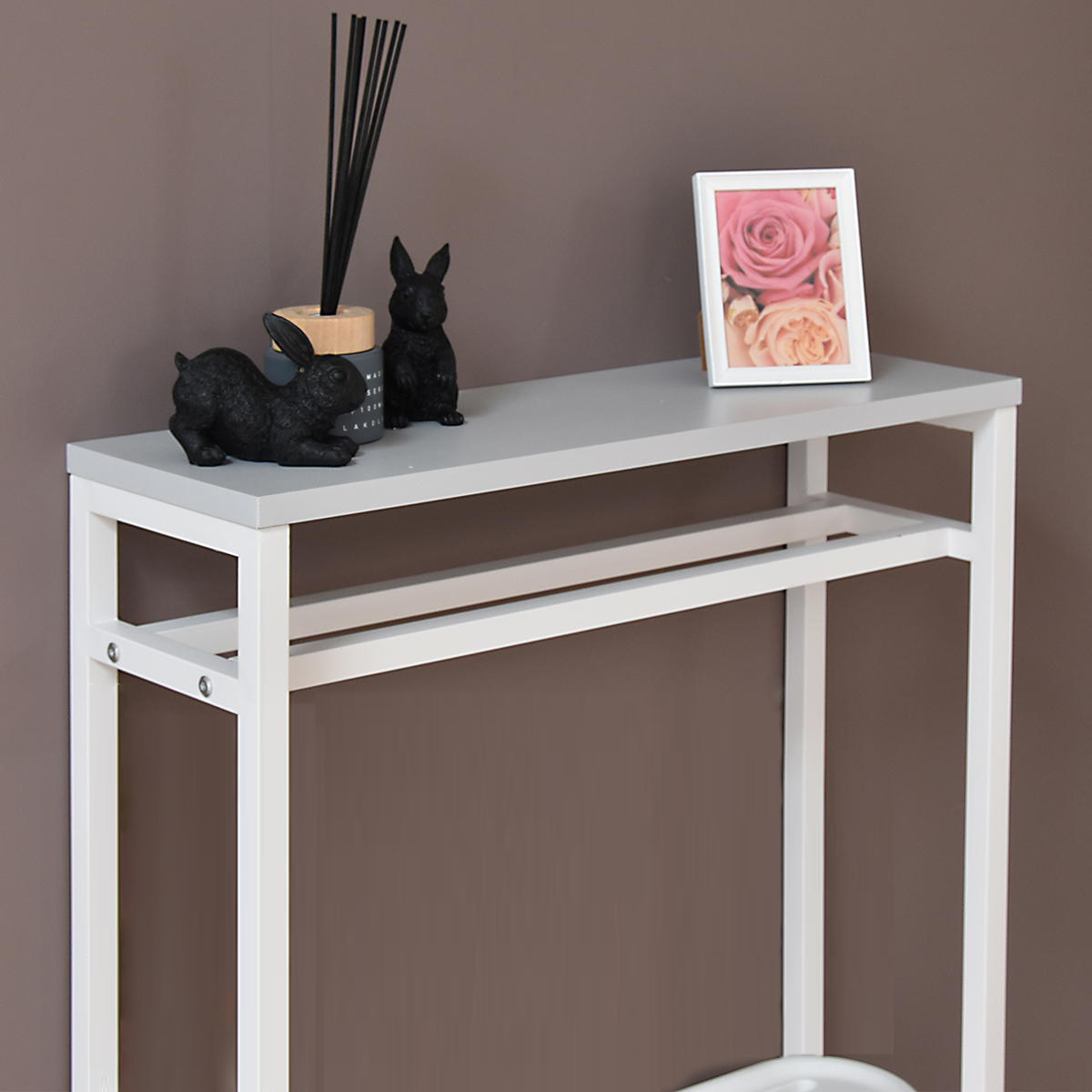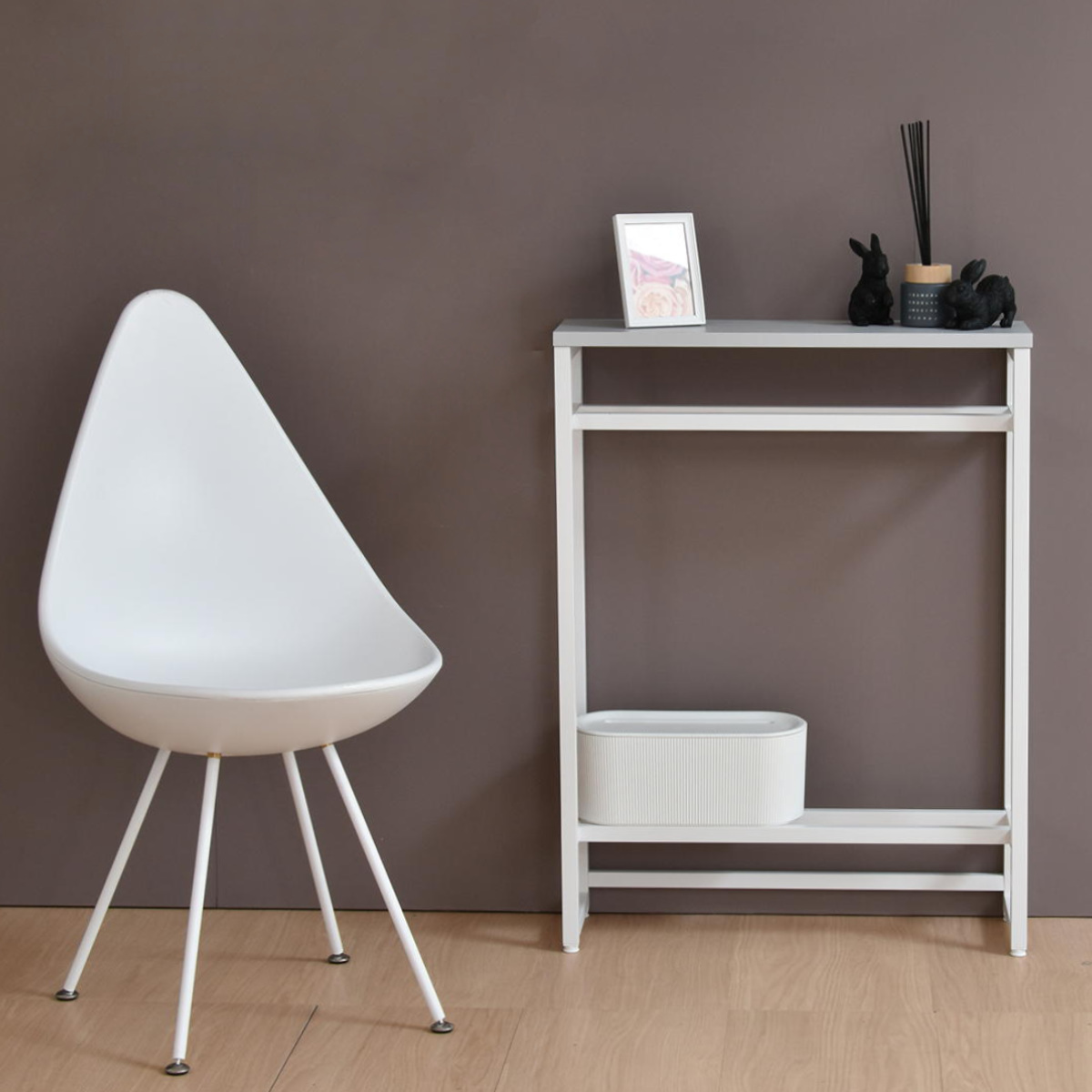 空間を引き締める玄関の小物収納棚や飾り棚になるコンソールテーブルです。マットな質感のメラミン天板とホワイトスチールの細いアイアンフレームだけで構成されたスタイリッシュな美しいデザインです。