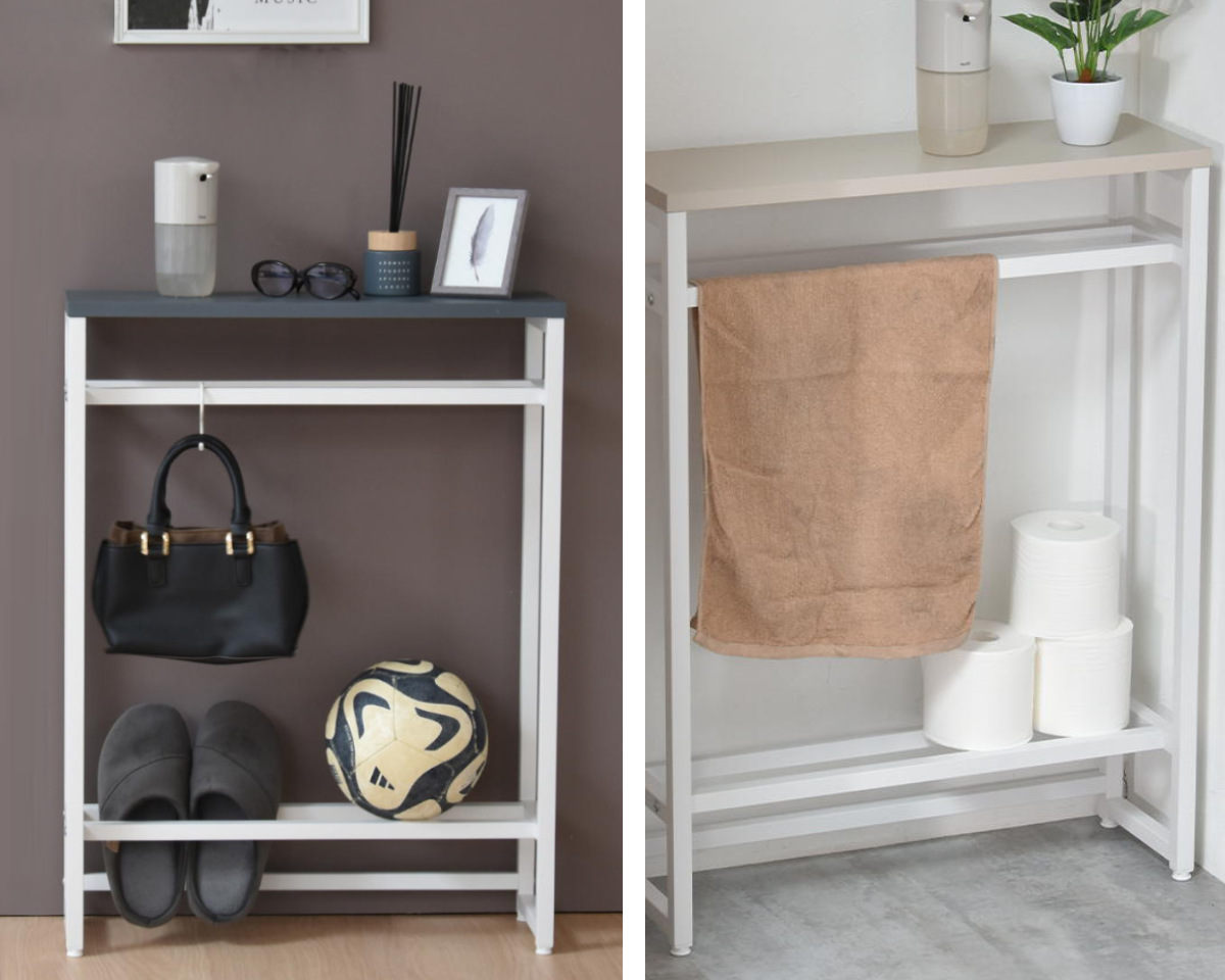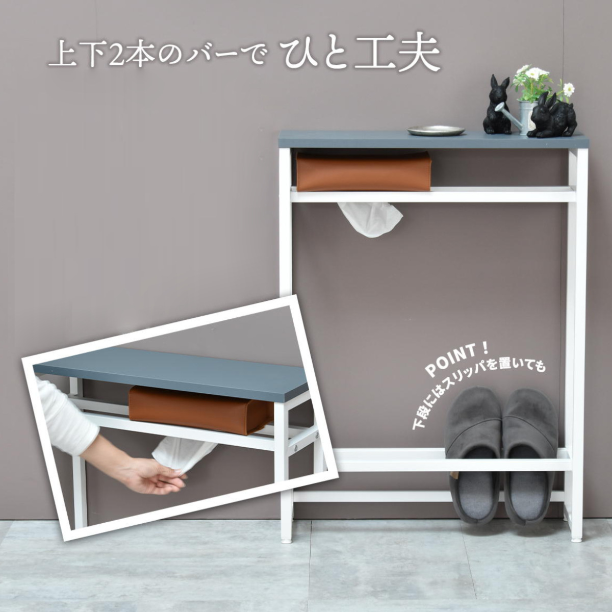 上段バーは、裏向けてティッシュを置くと取り出しやすくなります。生活感が出ないのでインテリアの邪魔になりません。下段バーの空間には、スリッパラックやマガジンラックを置けます。