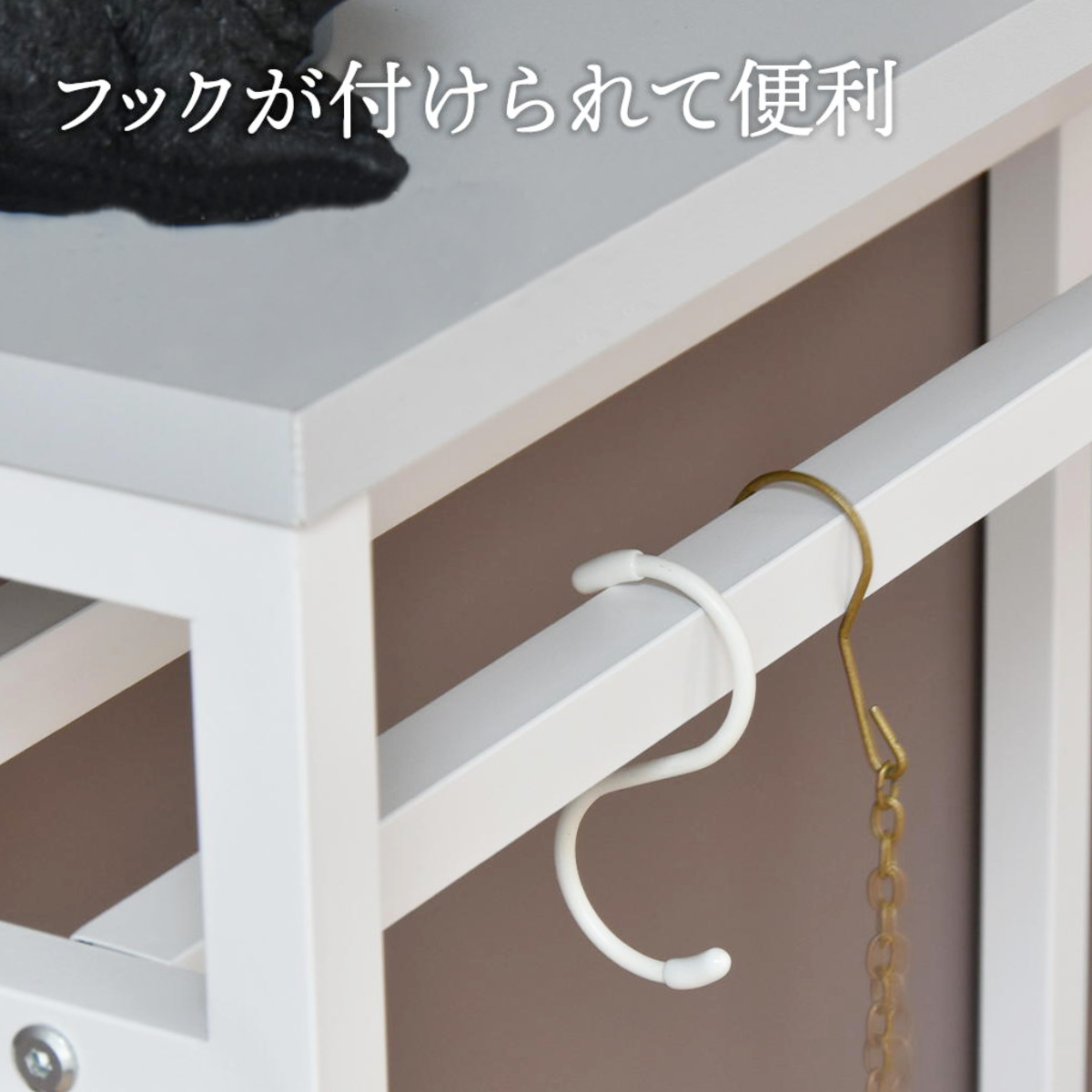 バーに市販のS字フックなどを付けて、折り畳み傘や靴べら、エコバッグや帽子などを引っ掛けて収納することができます。