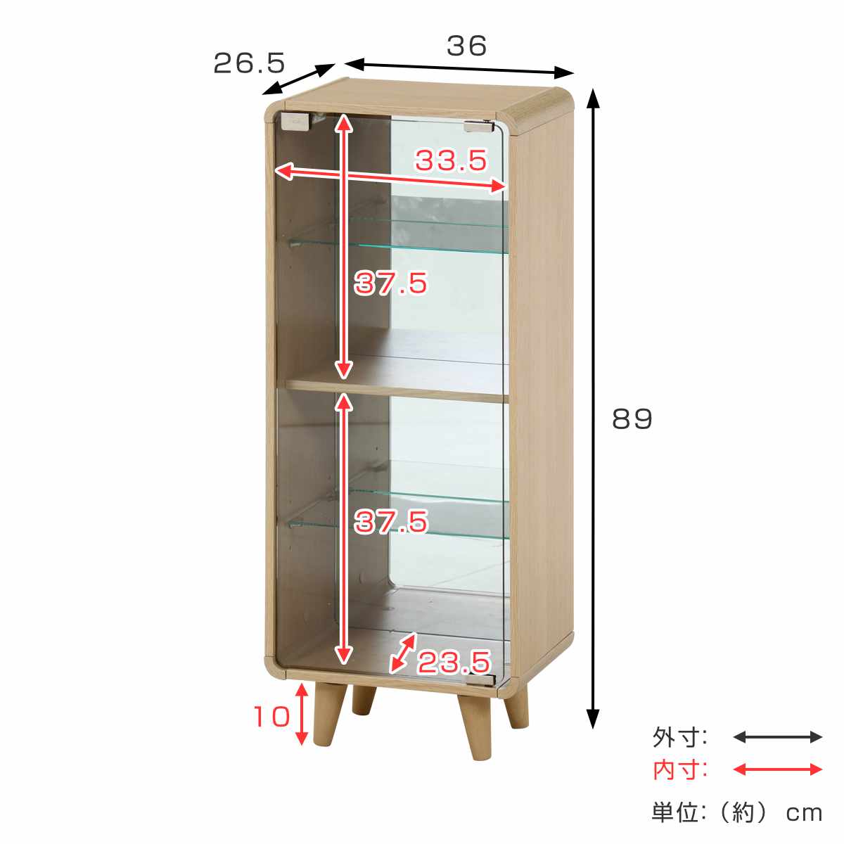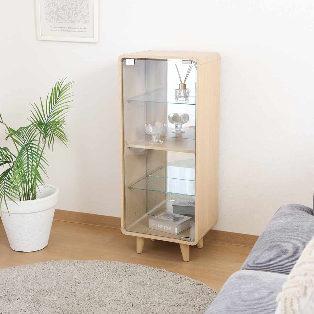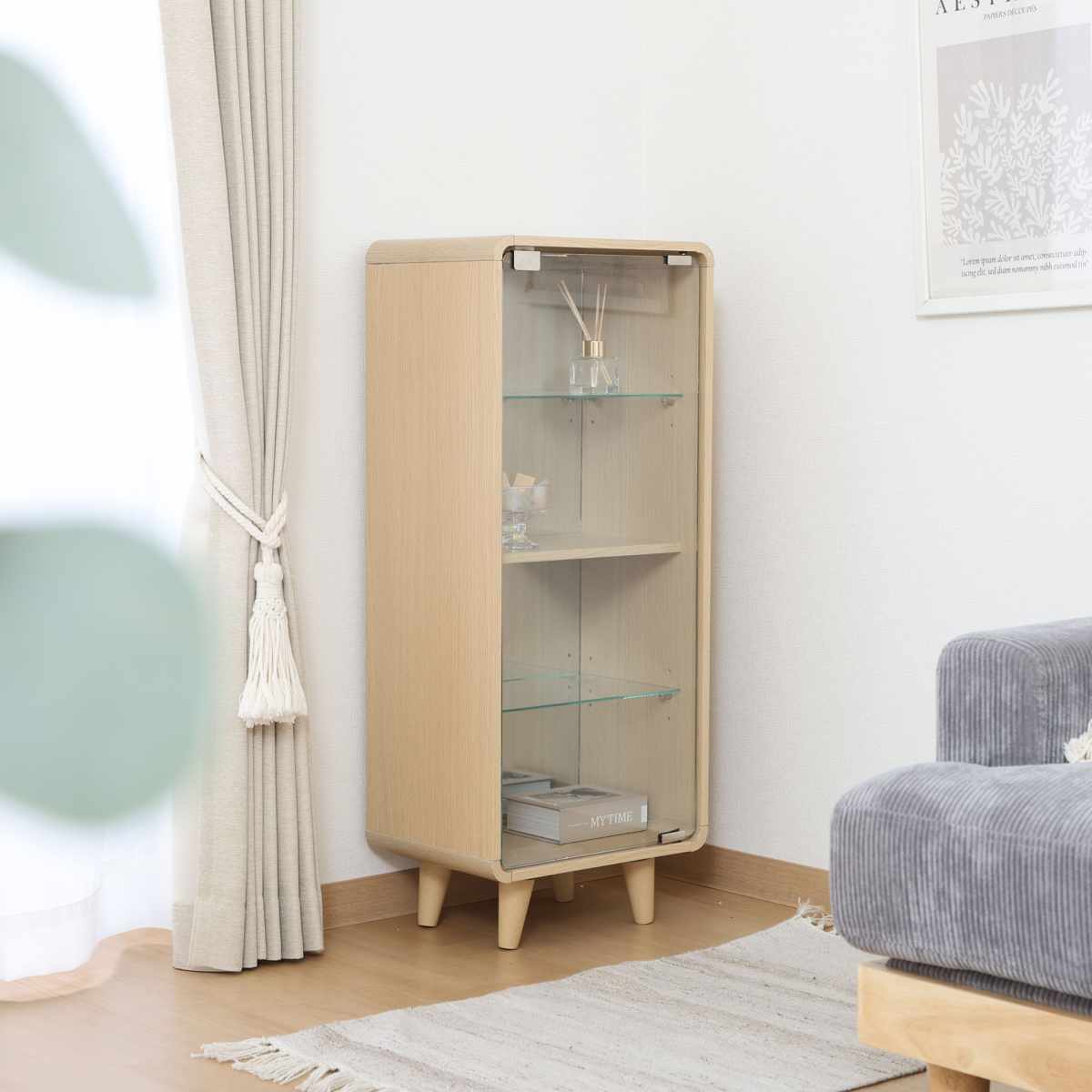 丸みのある木目調のフォルムにクリアガラスを組み合わせた、上品なコレクションシェルフです。透明なガラス扉が中のアイテムを美しく惹き立てるため、リビングで雑貨や小物を飾ったり、趣味のお部屋でフィギュアやコレクションを並べたりと、多彩なシーンでお使いいただけます。