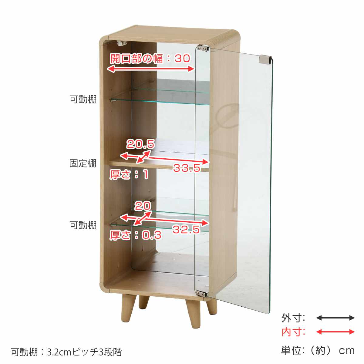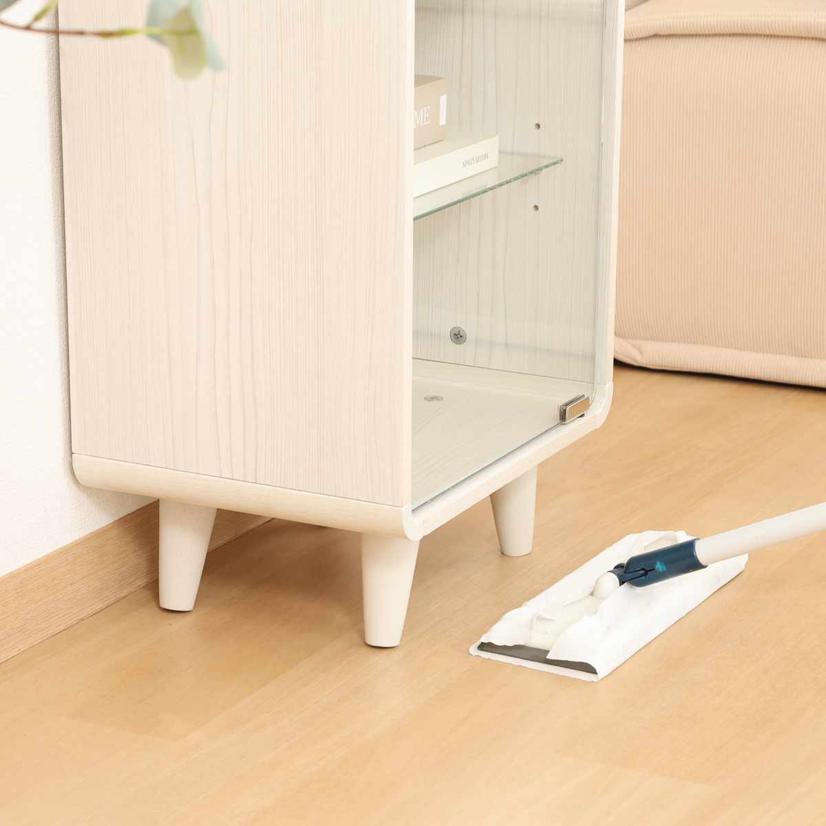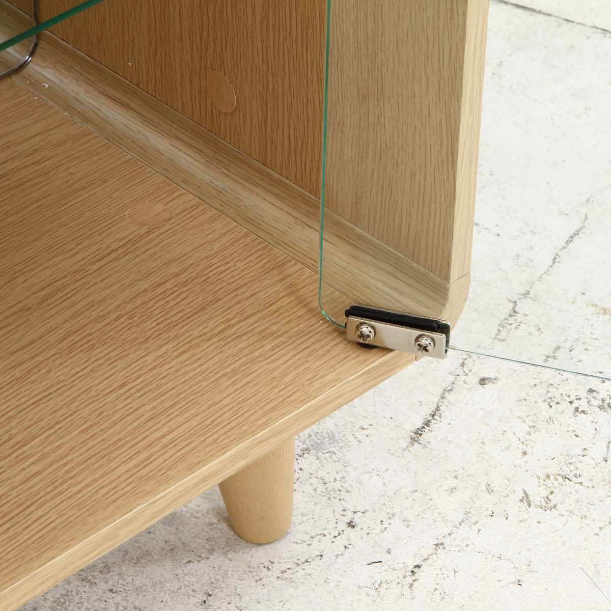 丸みのある木目調のフォルムにクリアガラスを組み合わせた、上品なコレクションシェルフです。透明なガラス扉が中のアイテムを美しく惹き立てるため、リビングで雑貨や小物を飾ったり、趣味のお部屋でフィギュアやコレクションを並べたりと、多彩なシーンでお使いいただけます。