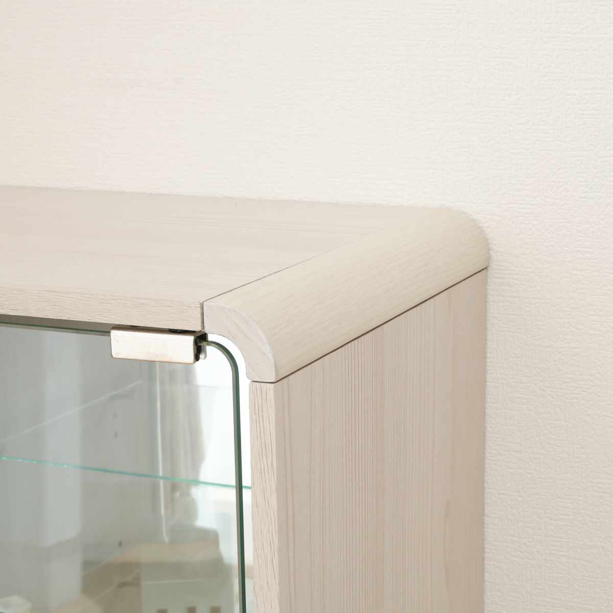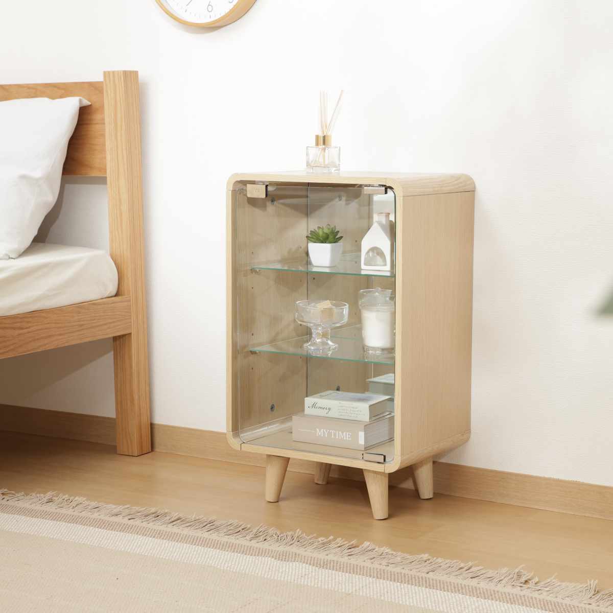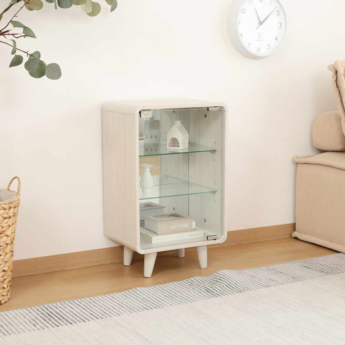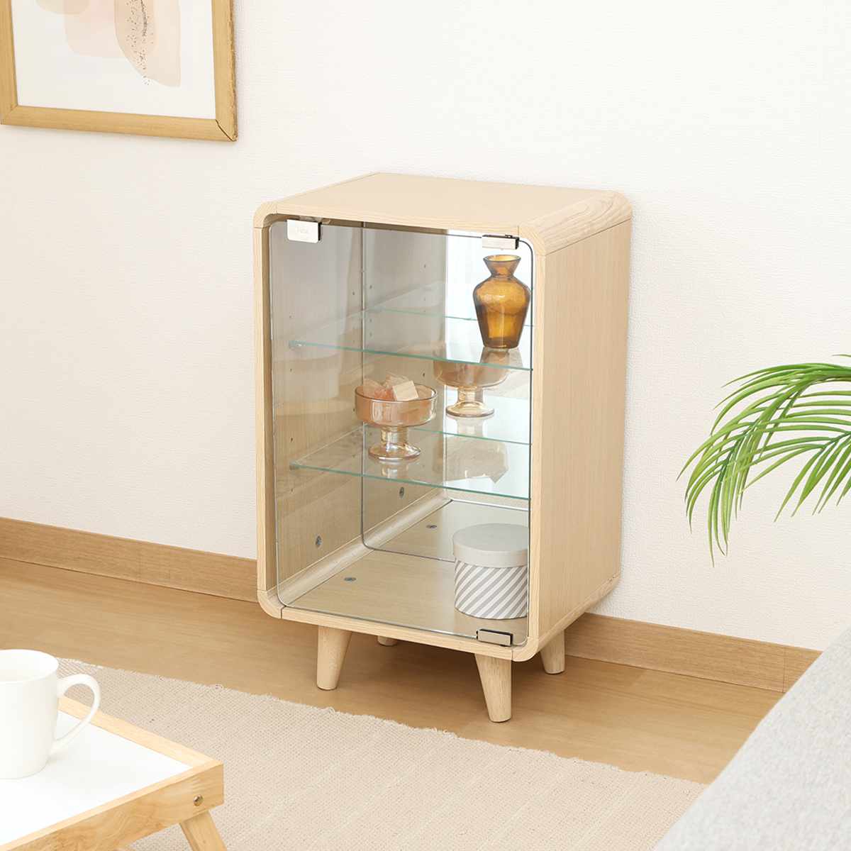 丸みのある木目調のフォルムにクリアガラスを組み合わせた、上品なコレクションシェルフです。透明なガラス扉が中のアイテムを美しく惹き立てるため、リビングで雑貨や小物を飾ったり、趣味のお部屋でフィギュアやコレクションを並べたりと、多彩なシーンでお使いいただけます。