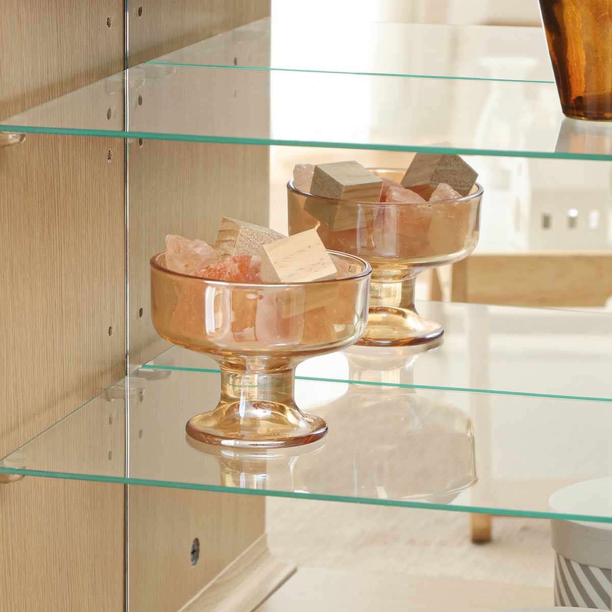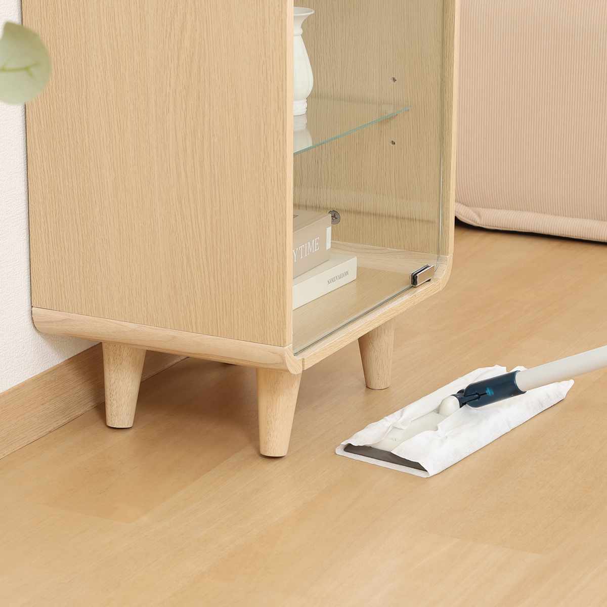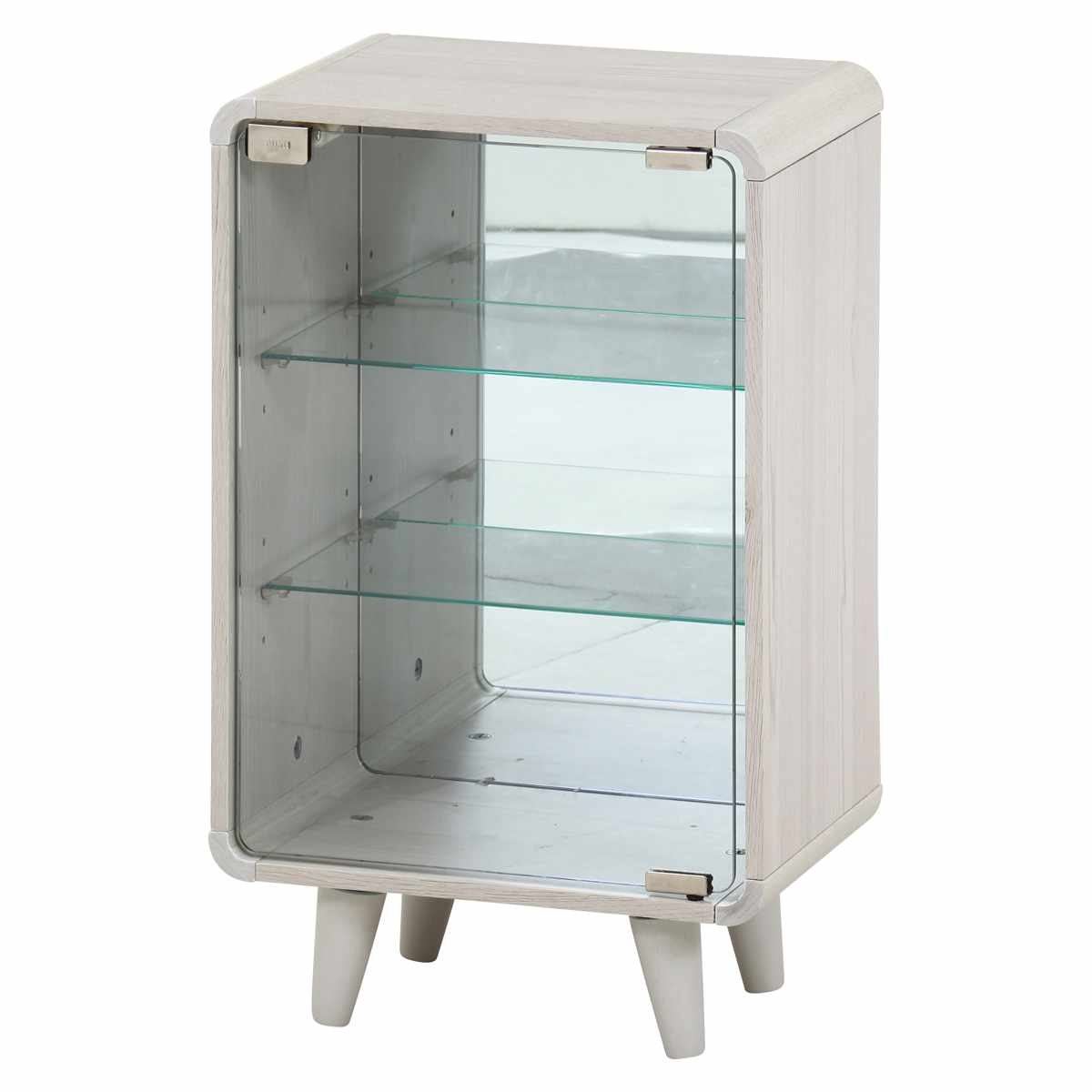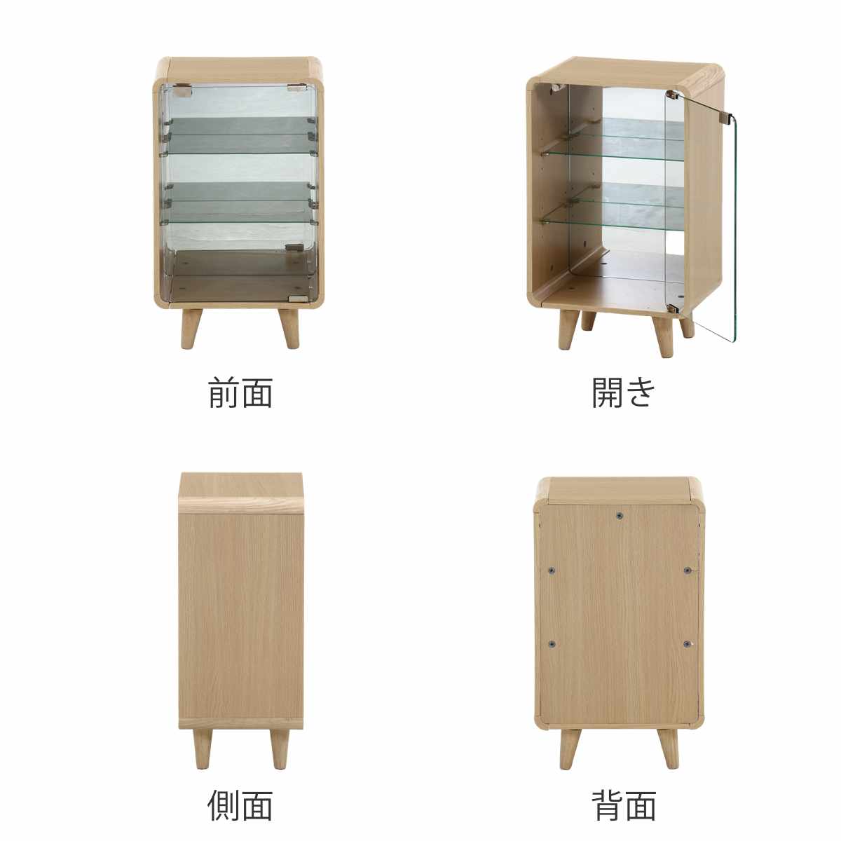 丸みのある木目調のフォルムにクリアガラスを組み合わせた、上品なコレクションシェルフです。透明なガラス扉が中のアイテムを美しく惹き立てるため、リビングで雑貨や小物を飾ったり、趣味のお部屋でフィギュアやコレクションを並べたりと、多彩なシーンでお使いいただけます。