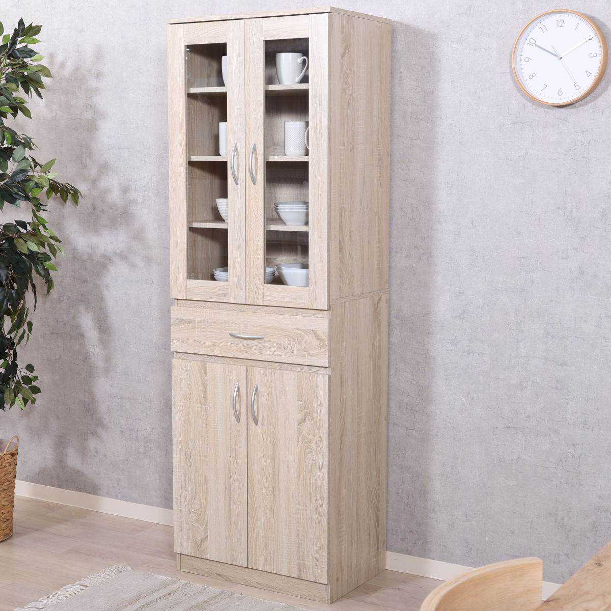高さを最大限に活かした、コンパクトながら大容量のキャビネットです。食器や調理器具をまとめてスッキリと整理できます。木目調の温かみのあるベーシックなデザインでお部屋に馴染み、狭いスペースにもフィットします。