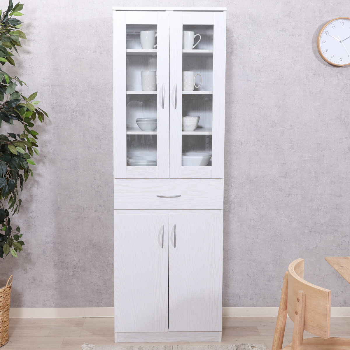 食器棚 幅59cm ハイキッチンボード ( カップボード キッチンボード ラック 棚 収納 キャビネット 食器収納 引き出し 可動棚 ナチュラル ホワイトウォッシュ シンプル ) 【ホワイトウォッシュ】