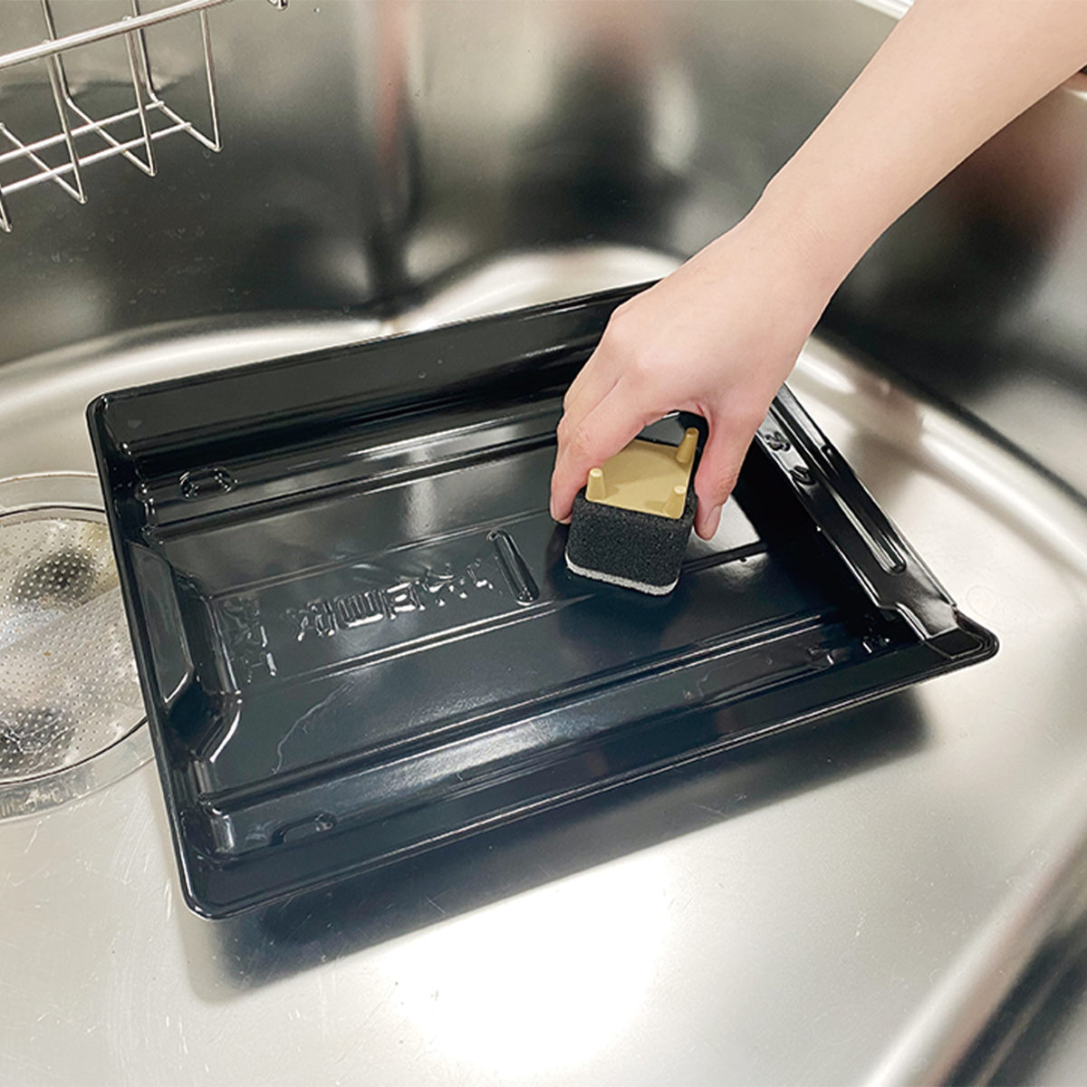 スポンジのトップにハードタイプのポリエステル不織布(研磨材付き)が付いており、キッチンや洗面台などの、ガンコな汚れ、コビリツキ汚れを落とします。