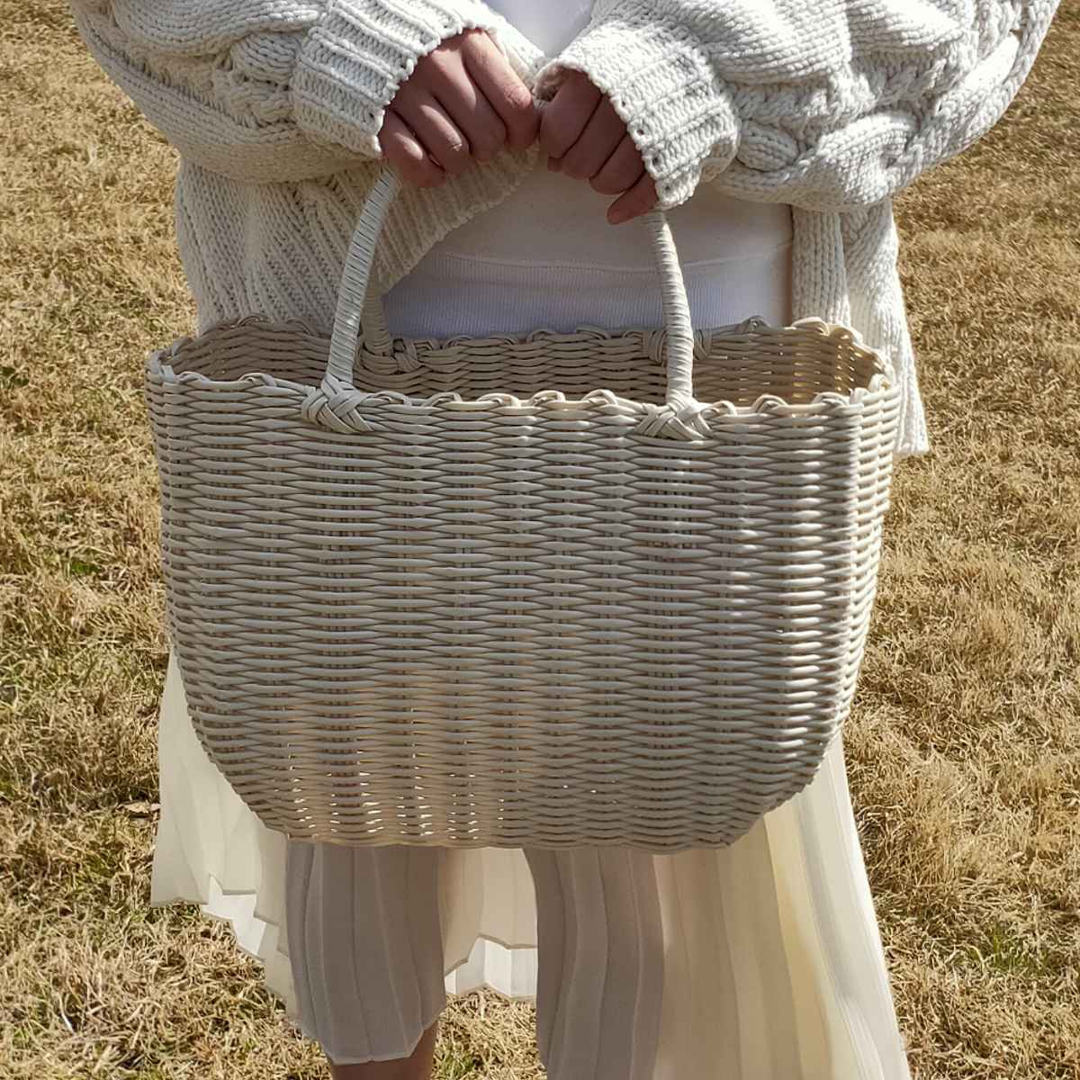 かごを編みやすい適正な粘度に加工し、抗菌素材を配合した素材をひとつひとつ職人が丁寧に編み上げて造られています。天然素材の温もりや味わいを再現し、やさしい風合いが感じられる逸品です。