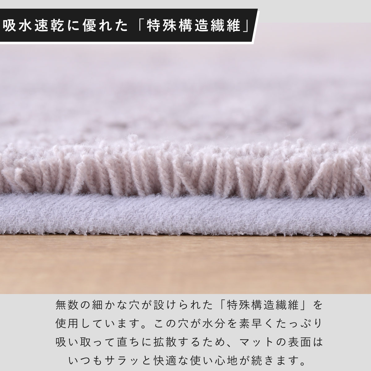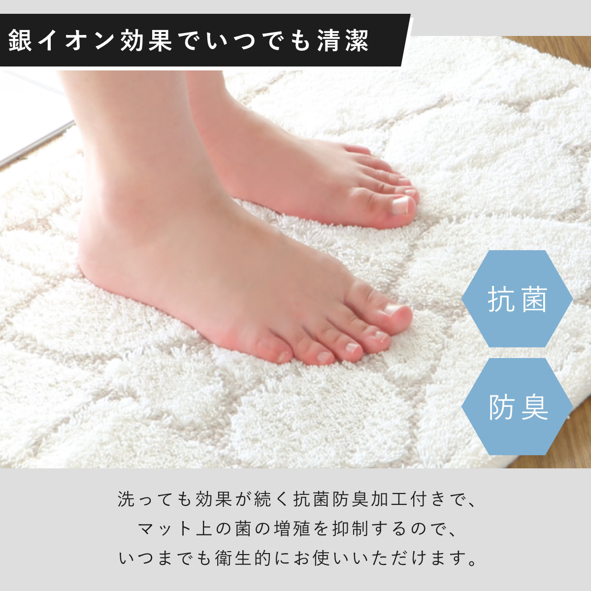 洗っても効果が続く抗菌防臭加工付きで、マット上の菌の増殖を抑制するので、いつまでも衛生的にお使いいただけます。