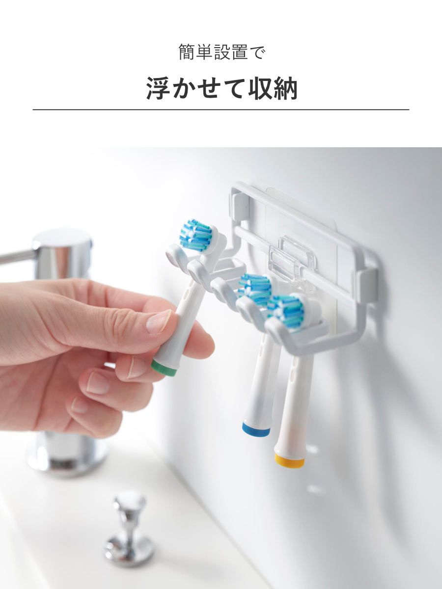 光沢のある壁面にフィルムフックで取り付ける、替え歯ブラシホルダーです。最大4本の歯ブラシを収納可能です。浮かせて収納できるので、通気性がよく衛生的です。
