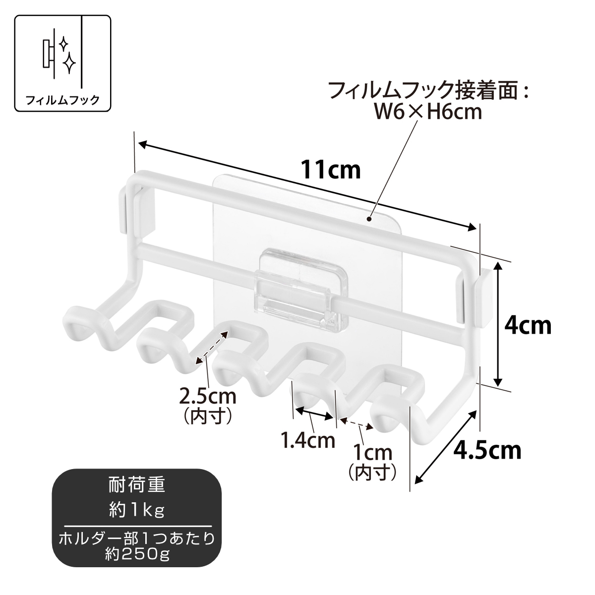 | サイズ | 本体:幅11×奥行4.5×高さ4cm(フィルムフック・クッション含まず) フィルムフック接着面:幅6×高さ6cm |