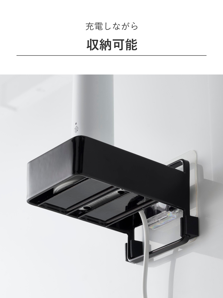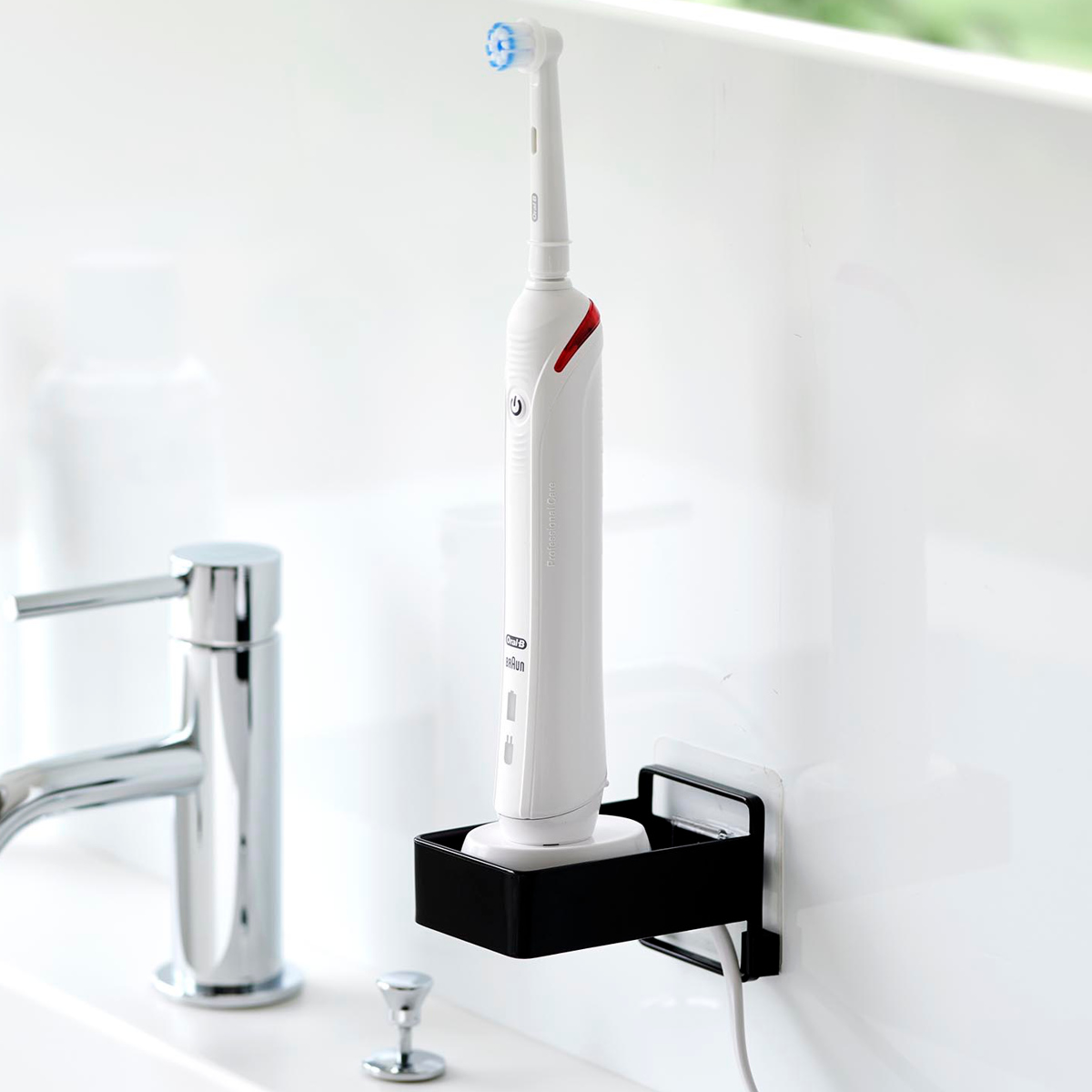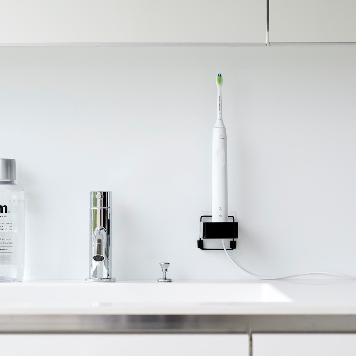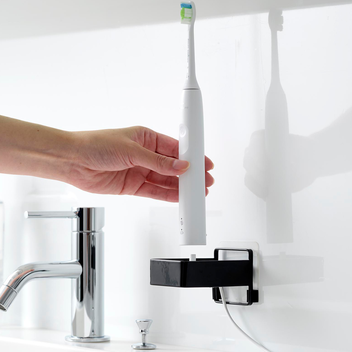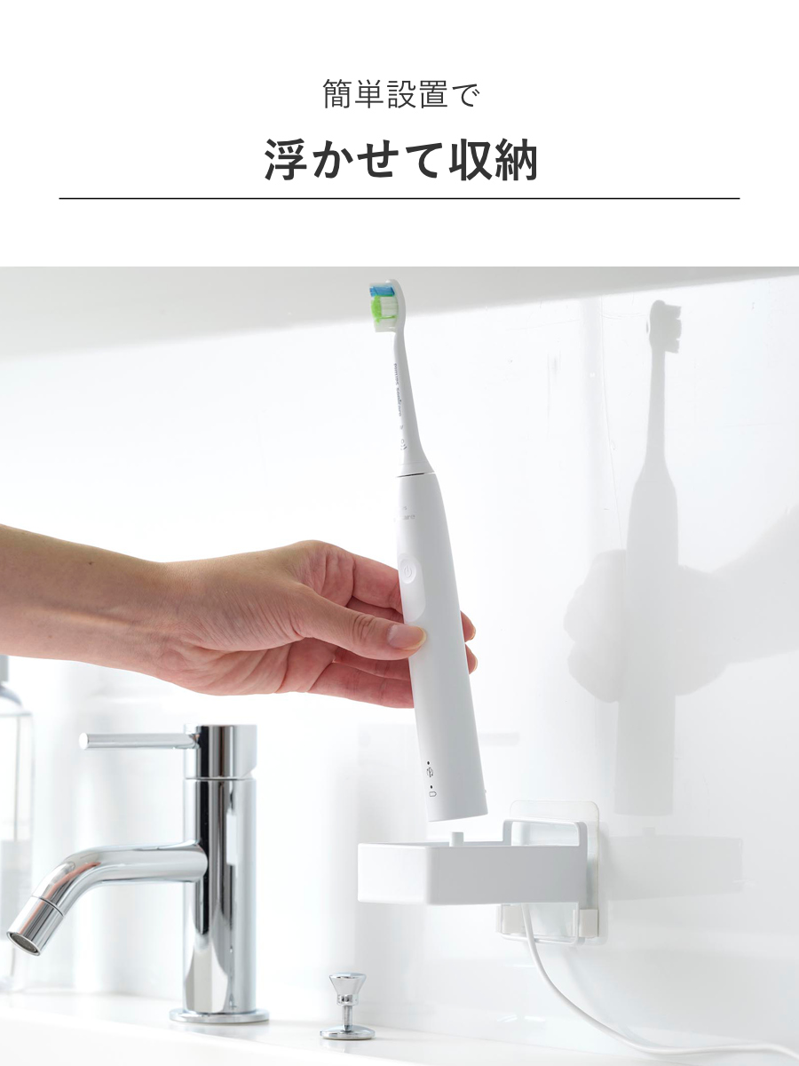 光沢のある壁面にフィルムフックで取り付ける、電動歯ブラシホルダーです。お好みの位置に浮かせて収納できるので、通気性がよく衛生的です。