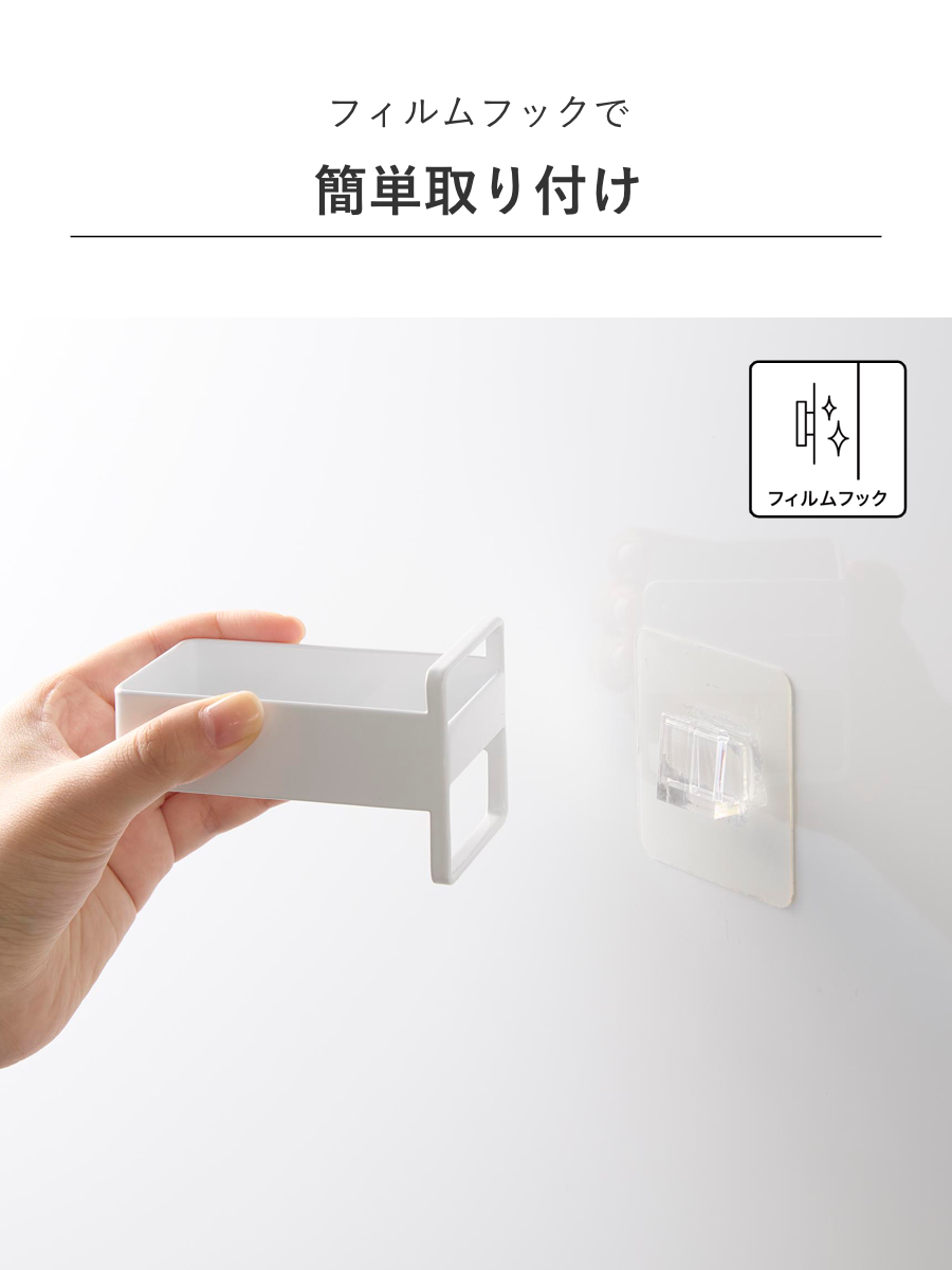 フィルムフックは粘着力が高く、壁に穴をあけずに設置できます。水にも強いのでシンク周りや洗面所・浴室でも気にせずに使えます。