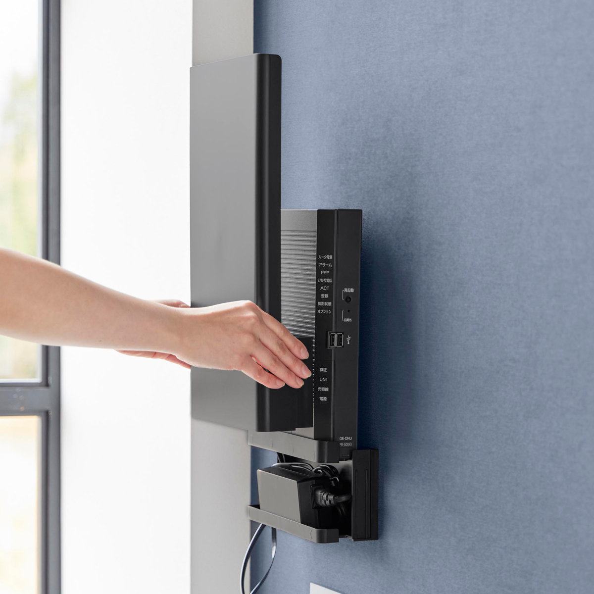前面カバーは脱着式なので、ルーターの再起動の際にも便利です。気になるホコリからしっかりと守ってくれるので、お手入れも簡単です。いたずら防止にもなり、見た目だけではなく使いやすさにもこだわりました。