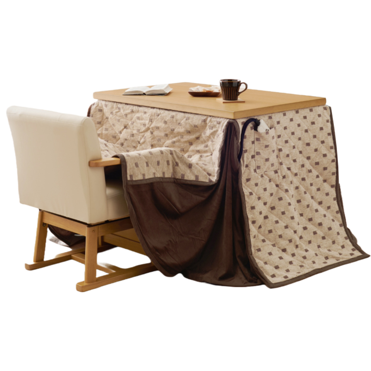 | 材質 | テーブル:天板(オーク突板(ダークブラウン)、アッシュ突板(ナチュラル))、脚部(ラバーウッド)、表面加工(UV塗装) ヒーター:MHU-601E(D) 600Wハロゲンヒーター(手元コントローラー付) ふとん:表地(ポリエステル(シェニール織))、中綿(ポリエステル)、裏地・スリットコーナー(ポリエステル) チェア:木部(ラバーウッド)、張地(合成皮革) |