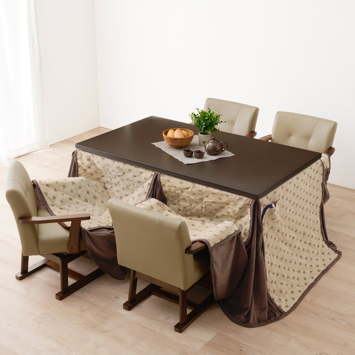 まとめて揃えられる6点セット テーブルサイズ 135cm×80cmデザイン性が高く、ヒーターが薄く見えにくい設計です。オフシーズン時に、こたつ布団を外した状態で横から見ても、ヒーターが見えにくくスッキリとしています。テーブル1台で夏も冬も快適に過ごせるのが嬉しいポイント。サイズ展開も豊富で、生活スタイルに合わせてお選びいただけます