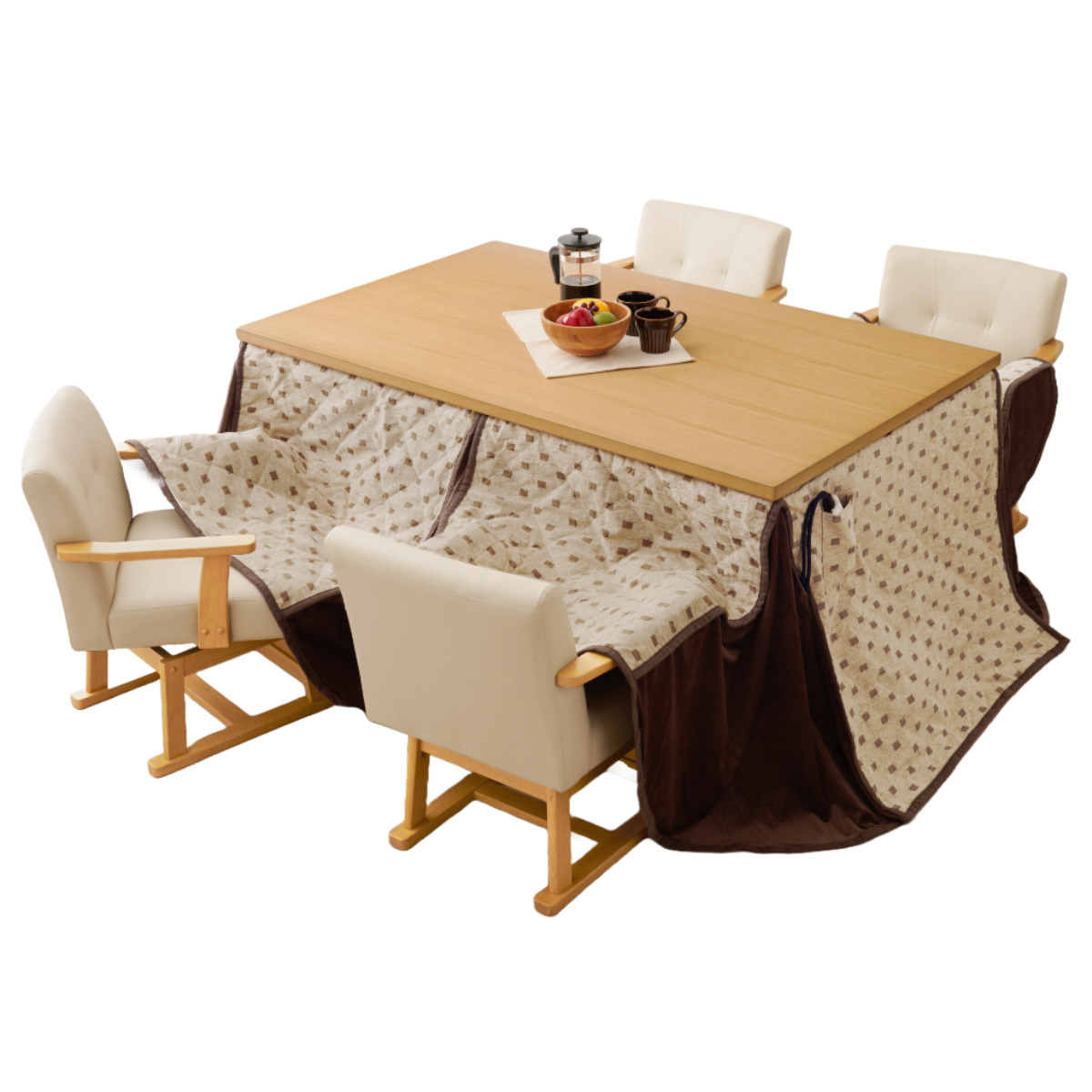 まとめて揃えられる6点セット テーブルサイズ 150cm×90cmデザイン性が高く、ヒーターが薄く見えにくい設計です。オフシーズン時に、こたつ布団を外した状態で横から見ても、ヒーターが見えにくくスッキリとしています。テーブル1台で夏も冬も快適に過ごせるのが嬉しいポイント。サイズ展開も豊富で、生活スタイルに合わせてお選びいただけます