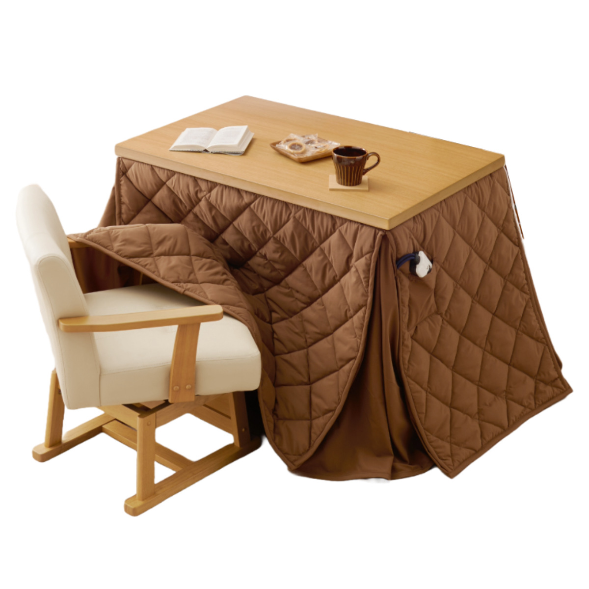 | 材質 | テーブル:天板(オーク突板(ダークブラウン)、アッシュ突板(ナチュラル))、脚部(ラバーウッド)、表面加工(UV塗装) ヒーター:MHU-601E(D) 600Wハロゲンヒーター(手元コントローラー付) ふとん:表地(ポリエステル(ピーチスキン))、中綿(ポリエステル(東レ マッシュロン使用))、裏地・スリットコーナー(ポリエステル(ピーチスキン)) チェア:木部(ラバーウッド)、張地(合成皮革) |