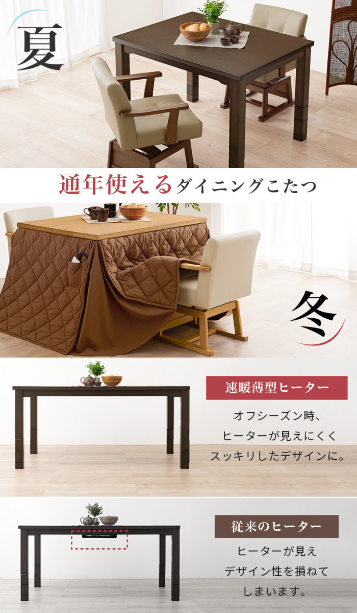 デザイン性が高く、ヒーターが薄く見えにくい設計です。オフシーズン時に、こたつ布団を外した状態で横から見ても、ヒーターが見えにくくスッキリとしています。テーブル1台で夏も冬も快適に過ごせるのが嬉しいポイント。サイズ展開も豊富で、生活スタイルに合わせてお選びいただけます。