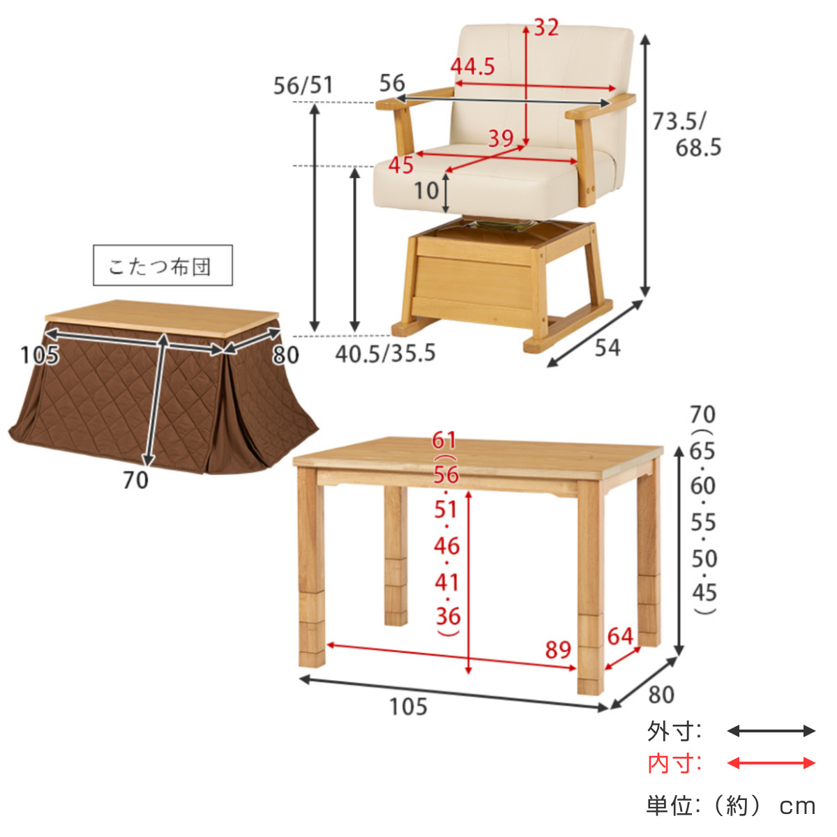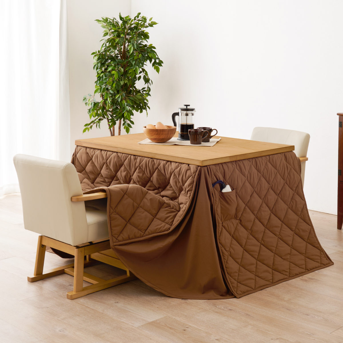 | 材質 | テーブル:天板(オーク突板(ダークブラウン)、アッシュ突板(ナチュラル))、脚部(ラバーウッド)、表面加工(UV塗装) ヒーター:MHU-601E(D) 600Wハロゲンヒーター(手元コントローラー付) ふとん:表地(ポリエステル(ピーチスキン))、中綿(ポリエステル(東レ マッシュロン使用))、裏地・スリットコーナー(ポリエステル(ピーチスキン)) チェア:木部(ラバーウッド)、張地(合成皮革) |