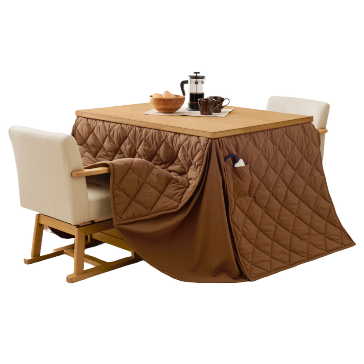| 材質 | テーブル:天板(オーク突板(ダークブラウン)、アッシュ突板(ナチュラル))、脚部(ラバーウッド)、表面加工(UV塗装) ヒーター:MHU-601E(D) 600Wハロゲンヒーター(手元コントローラー付) ふとん:表地(ポリエステル(ピーチスキン))、中綿(ポリエステル(東レ マッシュロン使用))、裏地・スリットコーナー(ポリエステル(ピーチスキン)) チェア:木部(ラバーウッド)、張地(合成皮革) |