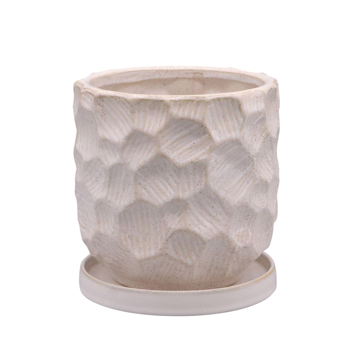 槌目模様のようなデザインが可愛いフラワーポットです。表面には光沢のある釉薬を使用し、植物をより活き活きと引き立たせます。底面には水抜き用の底穴が空いています。受け皿がついているので室内での使用にも最適です。