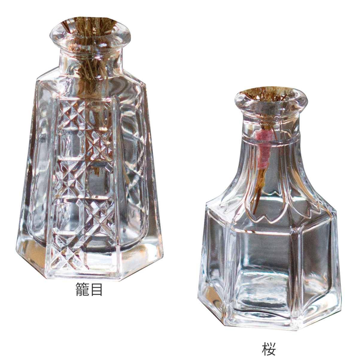 澄んだ硝子に浮かぶのは、日本の古典文様「籠目」と、春を象徴する可憐な桜。籠目は古来より魔除けや幸運を呼ぶとされ、桜は古くから武家で愛された花で、五穀豊穣や神仏加護のご利益があるとされています。その二つが重なり合うことで、凛とした品格とやさしさが宿ります。