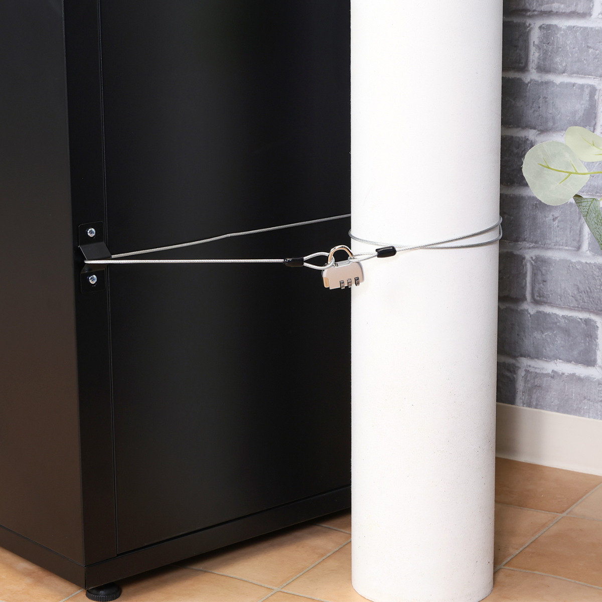 ボックス両側にワイヤー用の固定金具が付いているので、付属のワイヤーを通して家の柱やドアノブなどに固定することができます。