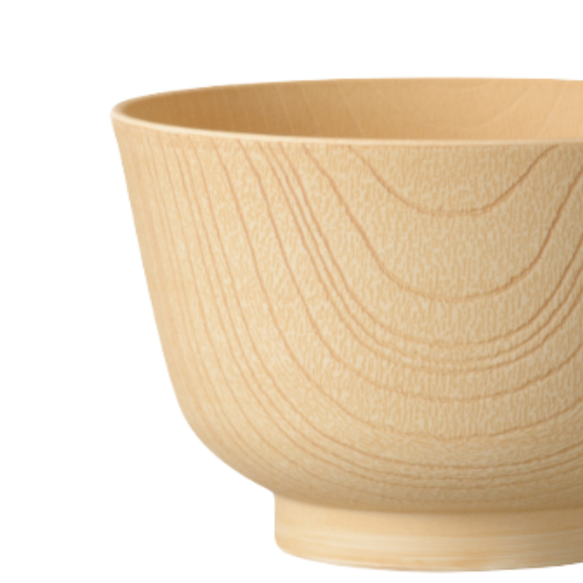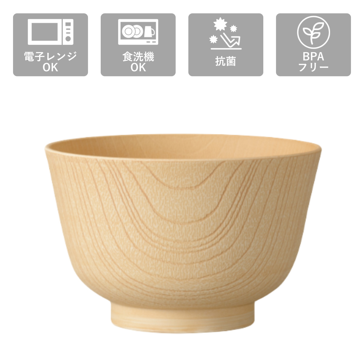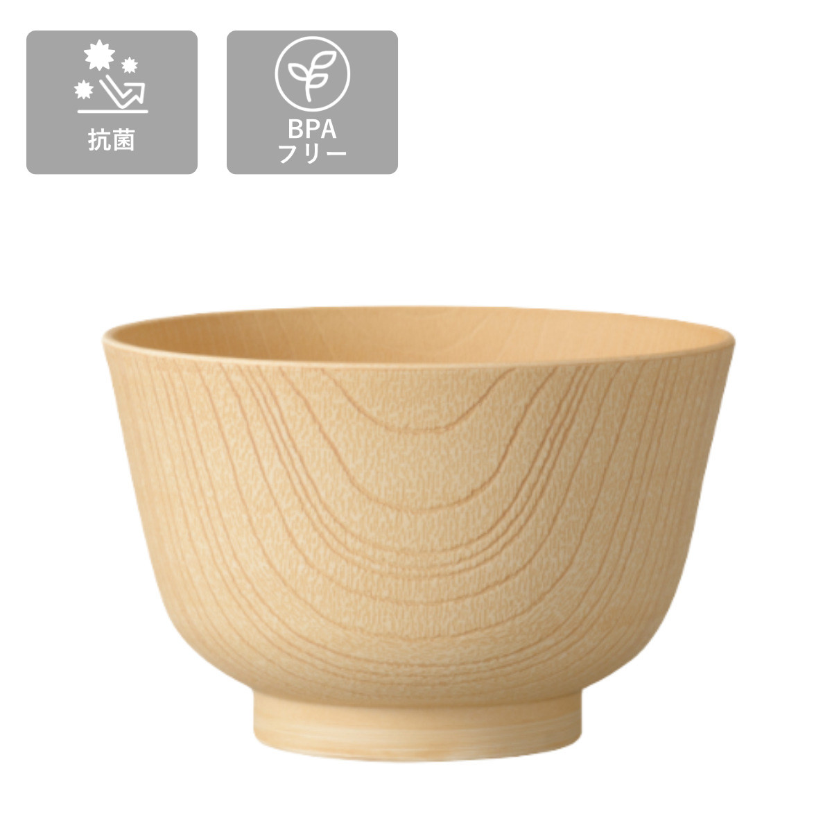 まる白木のような美しい木目デザインの汁椀です。軽くて割れにくく、扱いやすい樹脂製の食器なので毎日手軽にお使いいただけます。来客用から普段使いにも使えて、和でも洋でも合わせやすい汁椀です。
