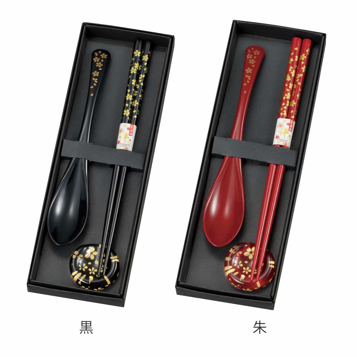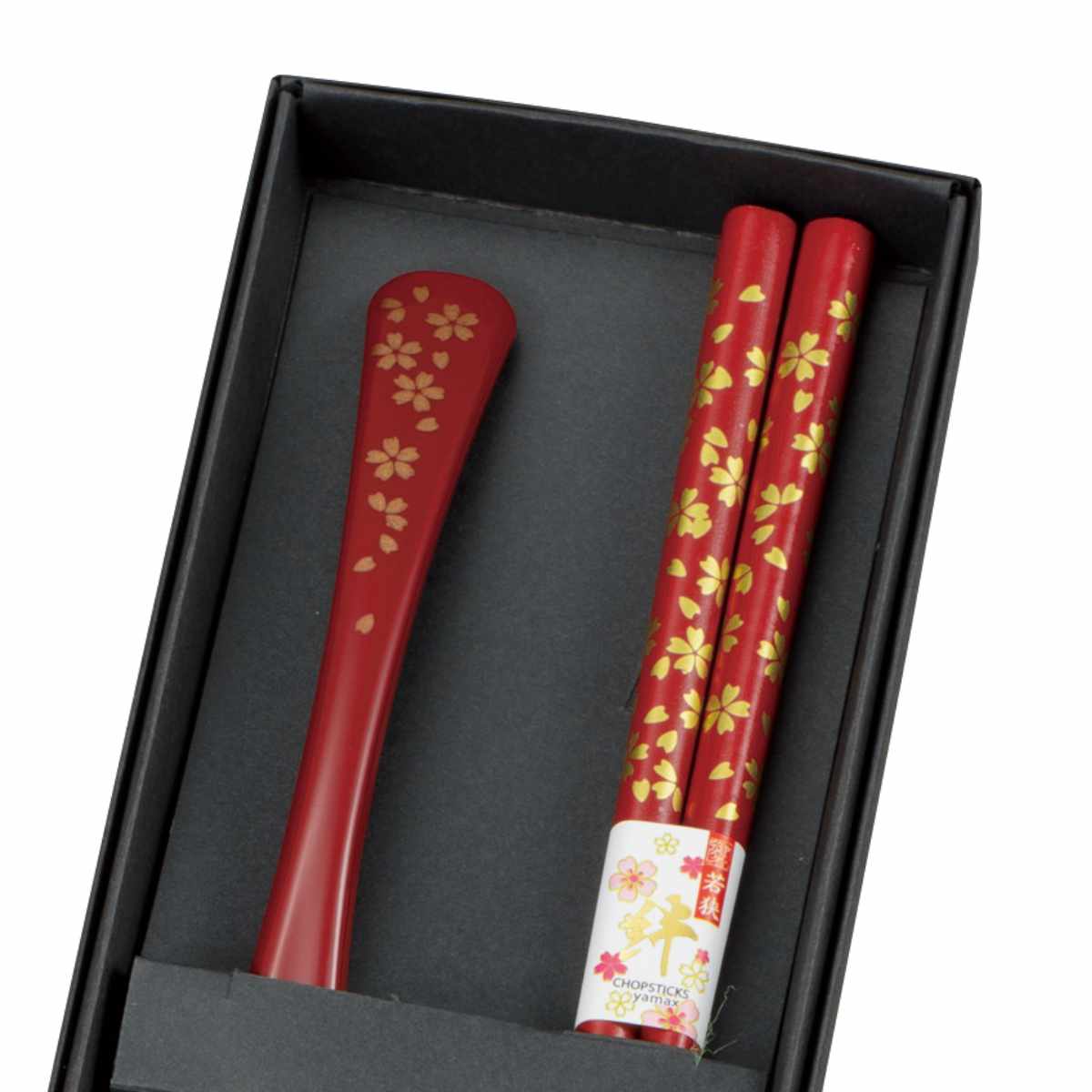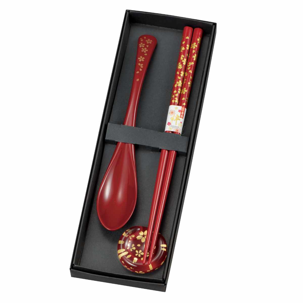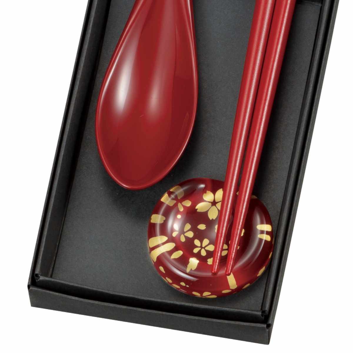 箸 箸置き スプーン 桜 3点セット ( 日本製 お箸 箸置 カトラリー 和柄 和 さくら はし おはし ハシ おしゃれ カトラリーレスト 贈り物 父の日 母の日 敬老の日 箱入り ) 【朱】