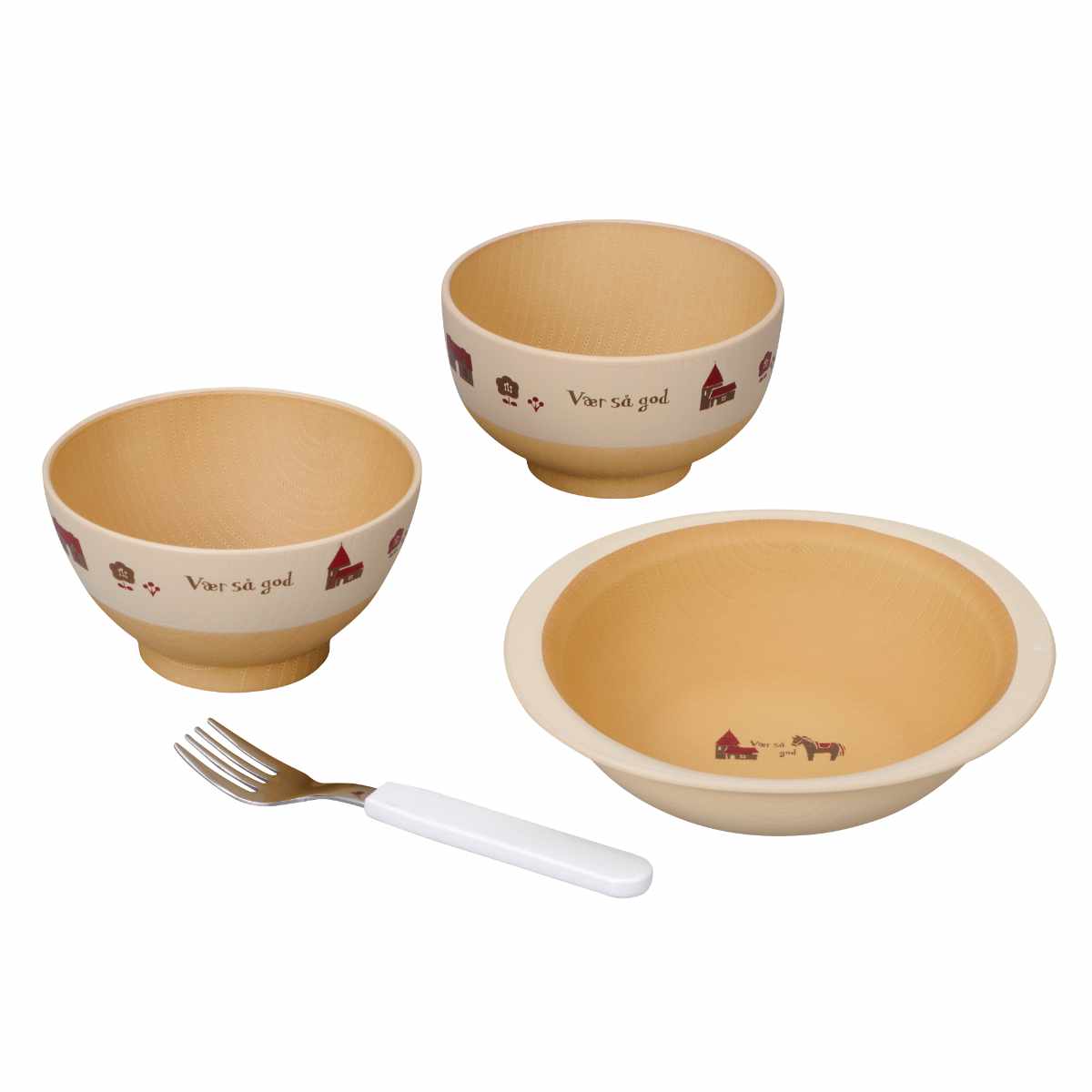 汁わん、飯わん、ボウル、フォークのセットです。離乳食期からお子様が成長後も普段使いとして長くお使いいただけます。充実したセット内容で、贈り物にもおすすめです。