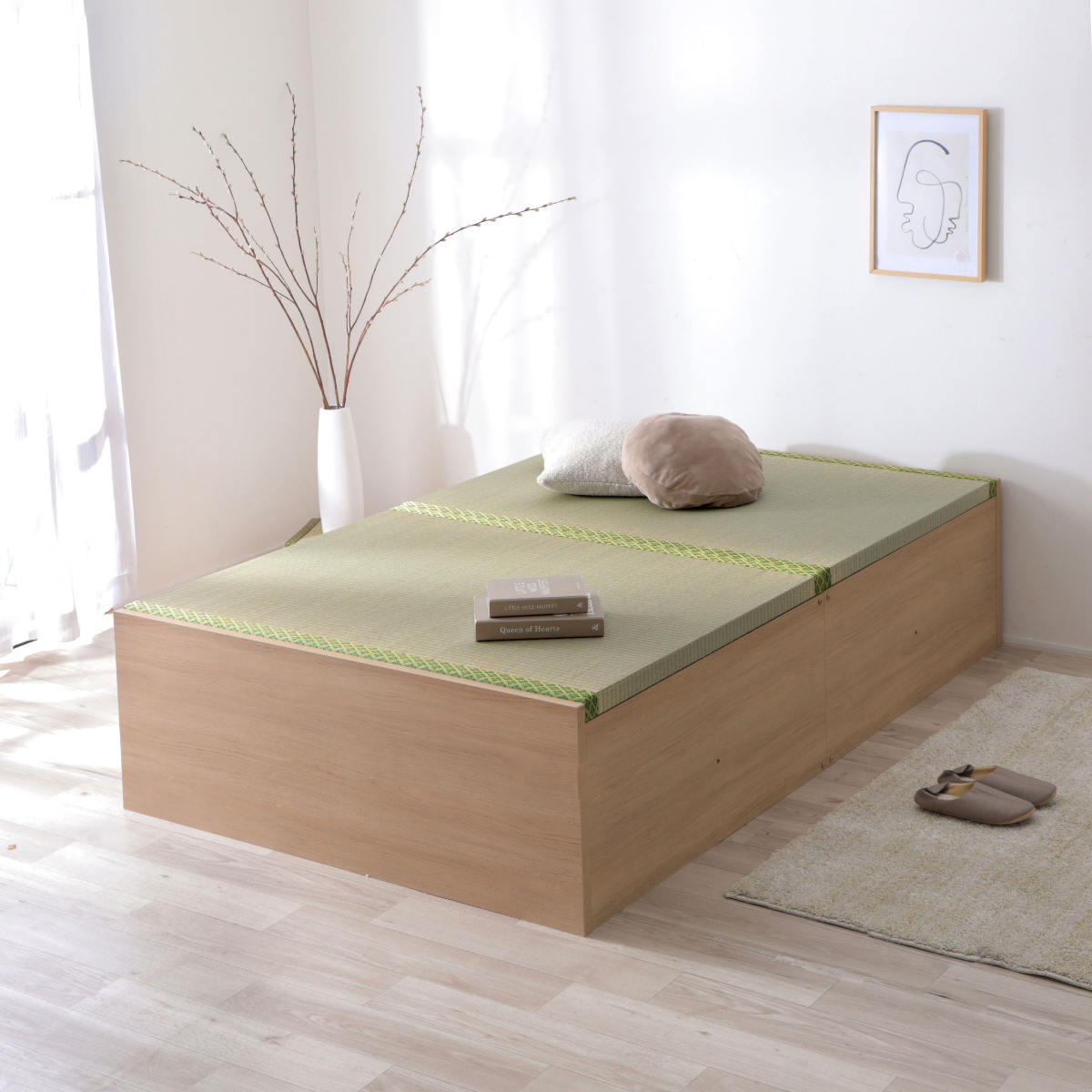 寝る・収納する・くつろぐが叶う、天然い草香りが爽やかな畳ベッドです。畳は、ホルムアルデヒドなどの有害な気体を吸着・除去する効果があるので、小さなお子さまやアレルギーが気になる方にも安心してご使用いただけます。同じシリーズで組み合わせられるので、お好みのサイズでお使いいただけます。