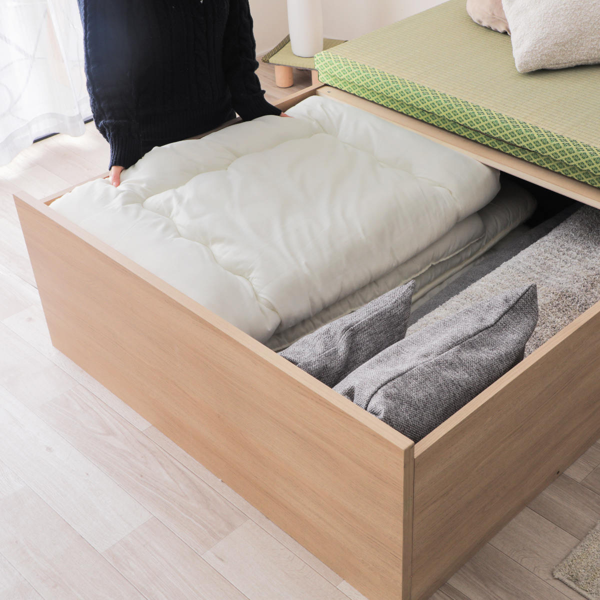 畳の下は、大容量の収納スペースとしてお使いいただけます。かさばるお布団やラグ、使用頻度の低いものの収納に最適です。通気性に配慮して、収納スペースの底にはすのこを使用しています。風通しが良いので、カビや湿気を防いでくれるので寝具などの保管にも安心です。