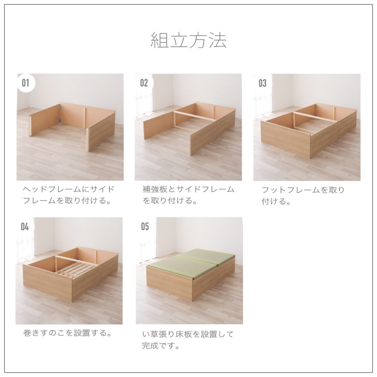 畳の香りがお部屋に広がる、天然のい草を使用しています。い草には、湿度を調整する力や消臭効果があり、寝室をいつも快適な空間に保つ働きがあります。夏は涼しく、冬は暖かいのでオールシーズンお使いいただけます。