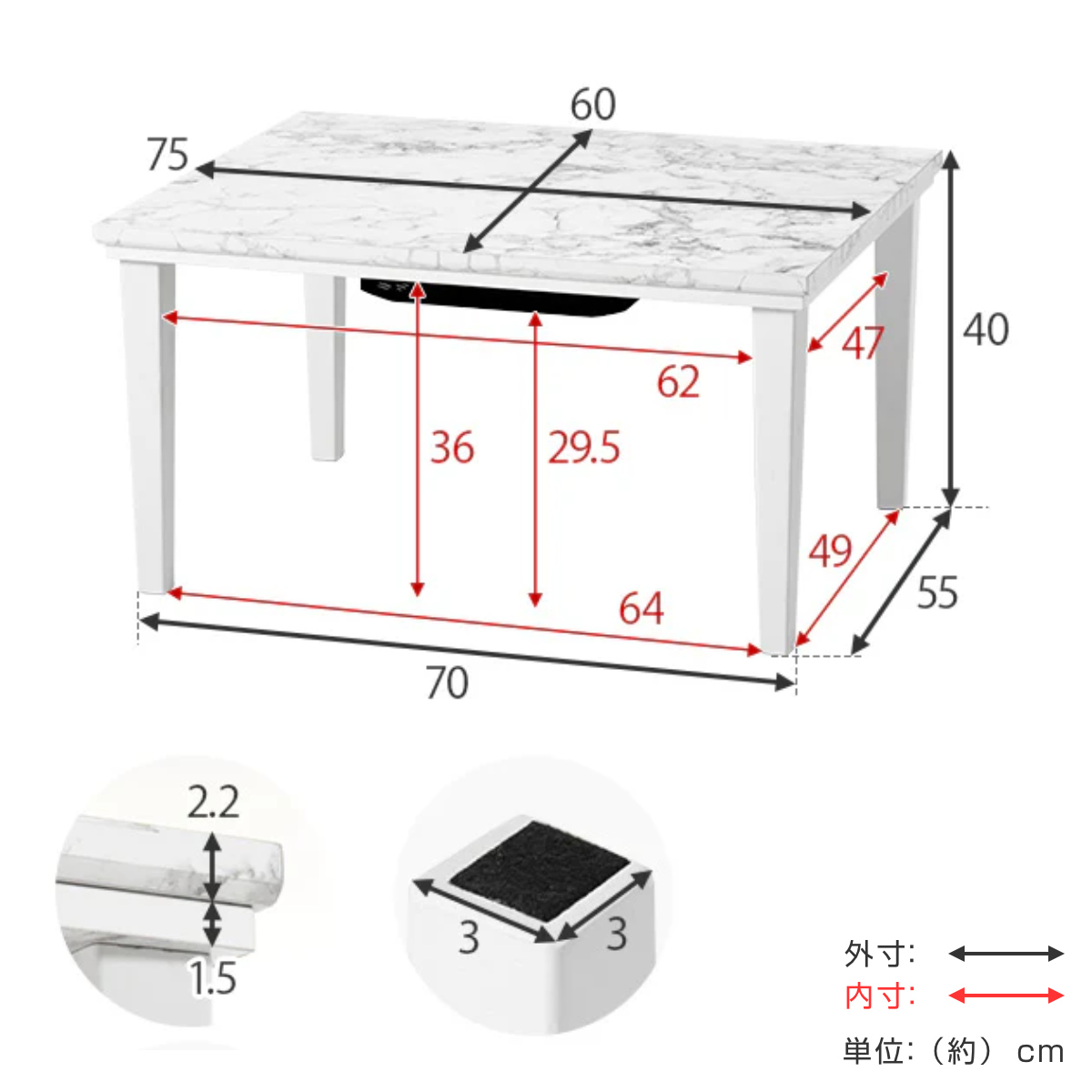 こたつテーブル 幅75cm コンパクト 大理石柄 カジュアルコタツ アルラ ( こたつ テーブル リビングテーブル ローテーブル 長方形 コタツ 天板 メラミン樹脂 1年中 使える 座卓 おしゃれ 遠赤外線 奥行60cm センターテーブル )