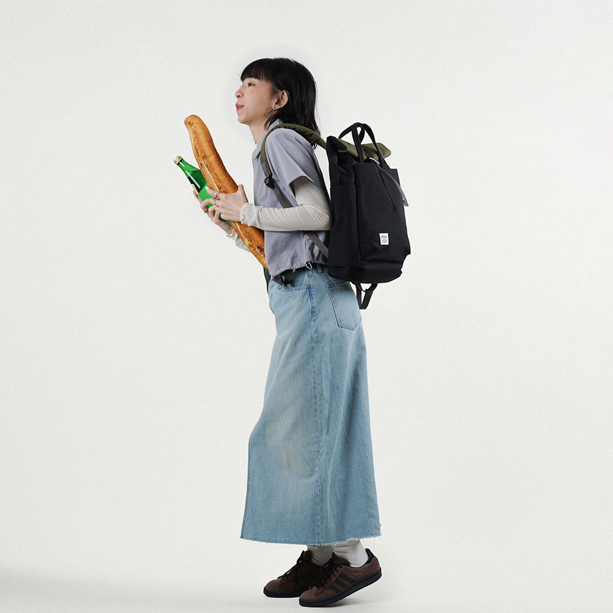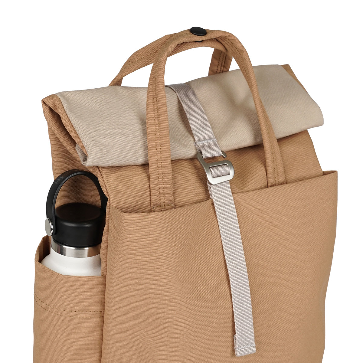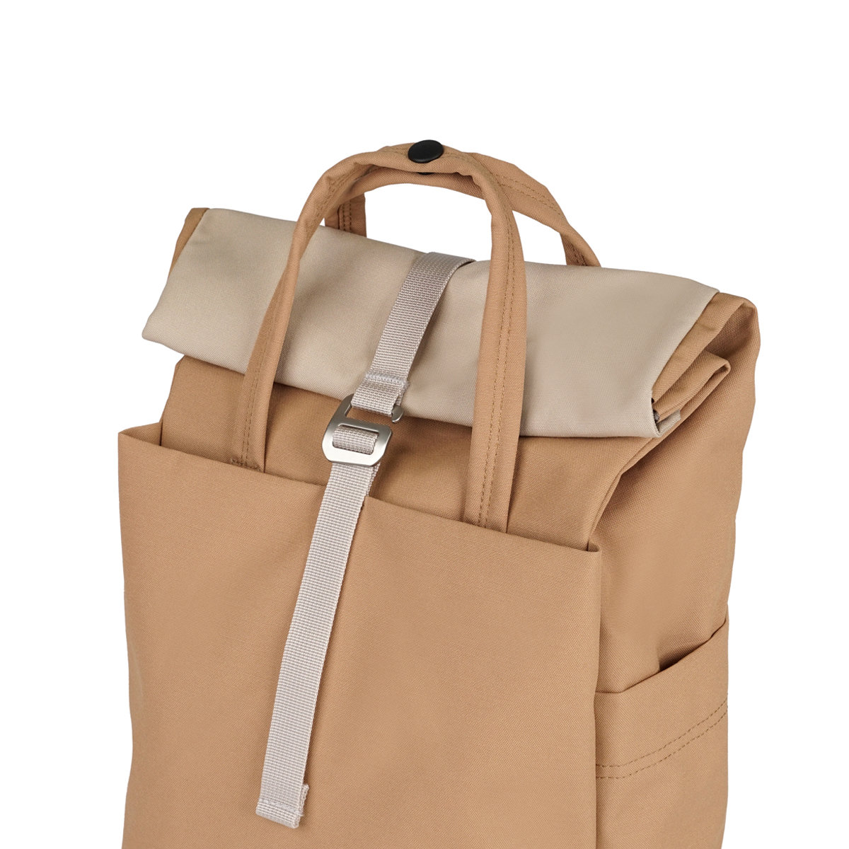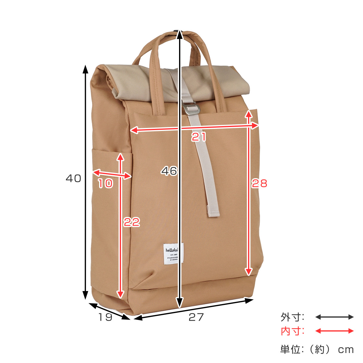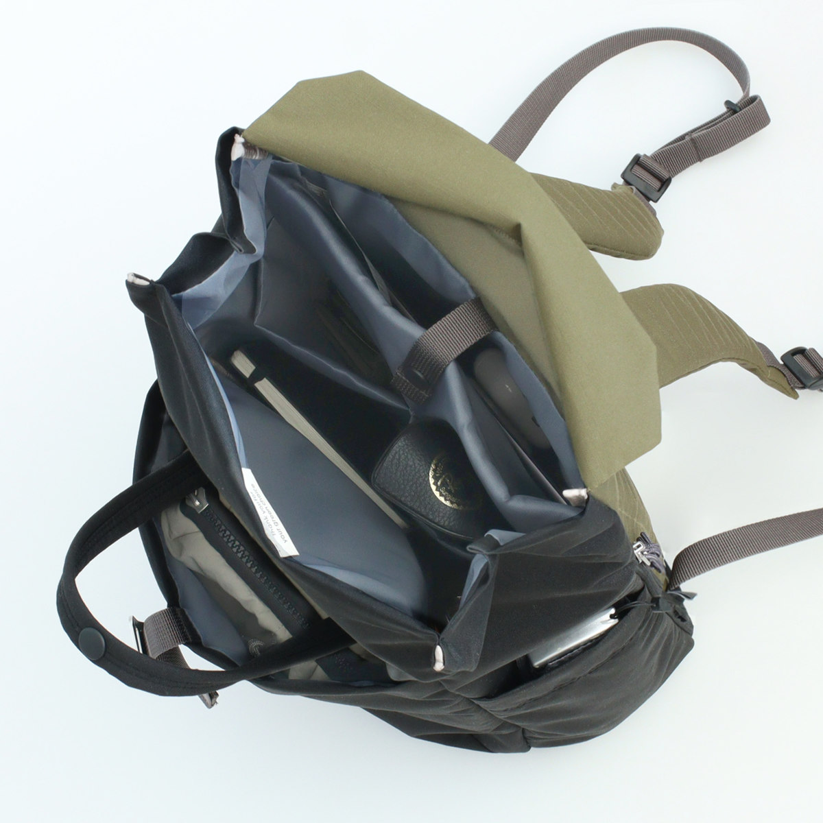 拡張して使えるロールトップ仕様で、荷物の量に合わせてバッグのサイズを調整できます。外出先で急に荷物が増えても簡単に拡張できます。