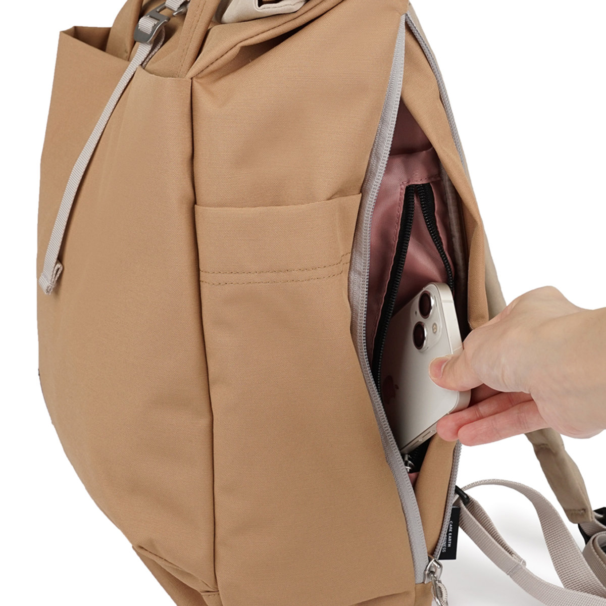 背面にはメイン収納につながるファスナーがあり、奥の荷物も上から開けずに取り出せます。背面ファスナーを開けたすぐ横にはファスナー付きの隠しポケットが付いており、大切な貴重品をしっかりと守ることができます。