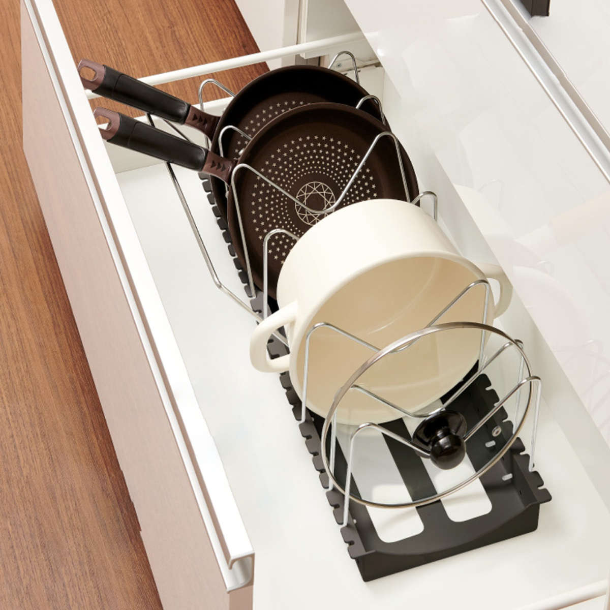フライパンを立てて収納することで、散らかりがちだった引き出しの中がスッキリ整理され、より使いやすく生まれ変わります。