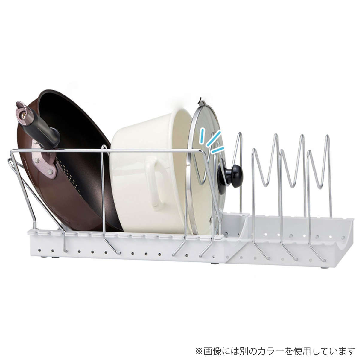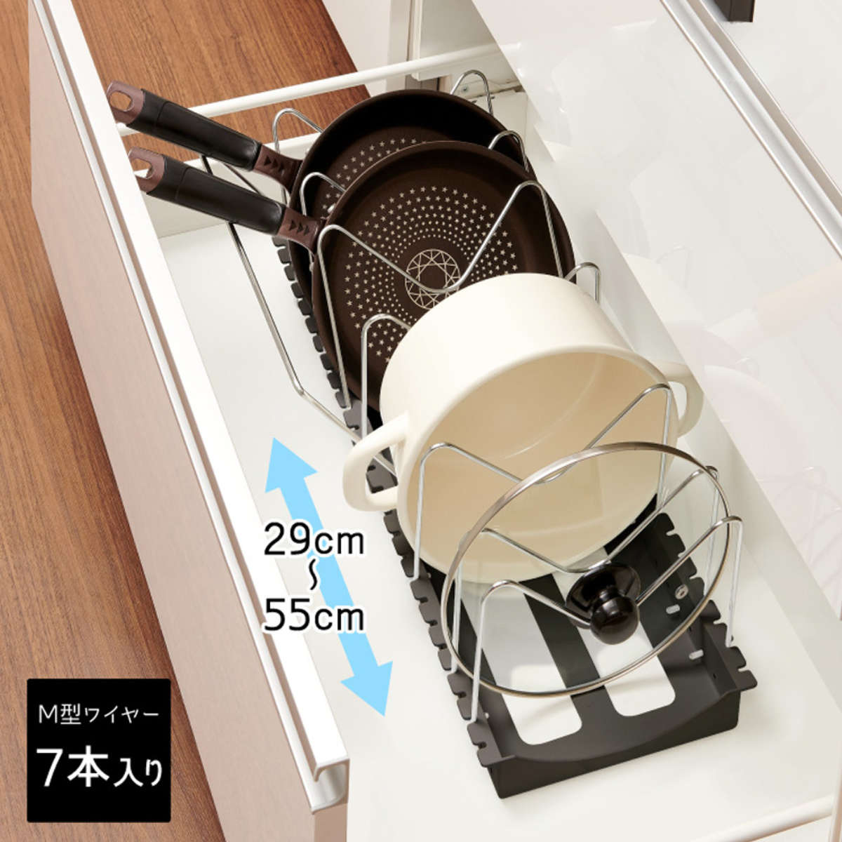 収納する物の幅に合わせて2cm間隔で調整でき、ワイヤー部分のへこみにフタの取っ手を掛けて収納することもできます。