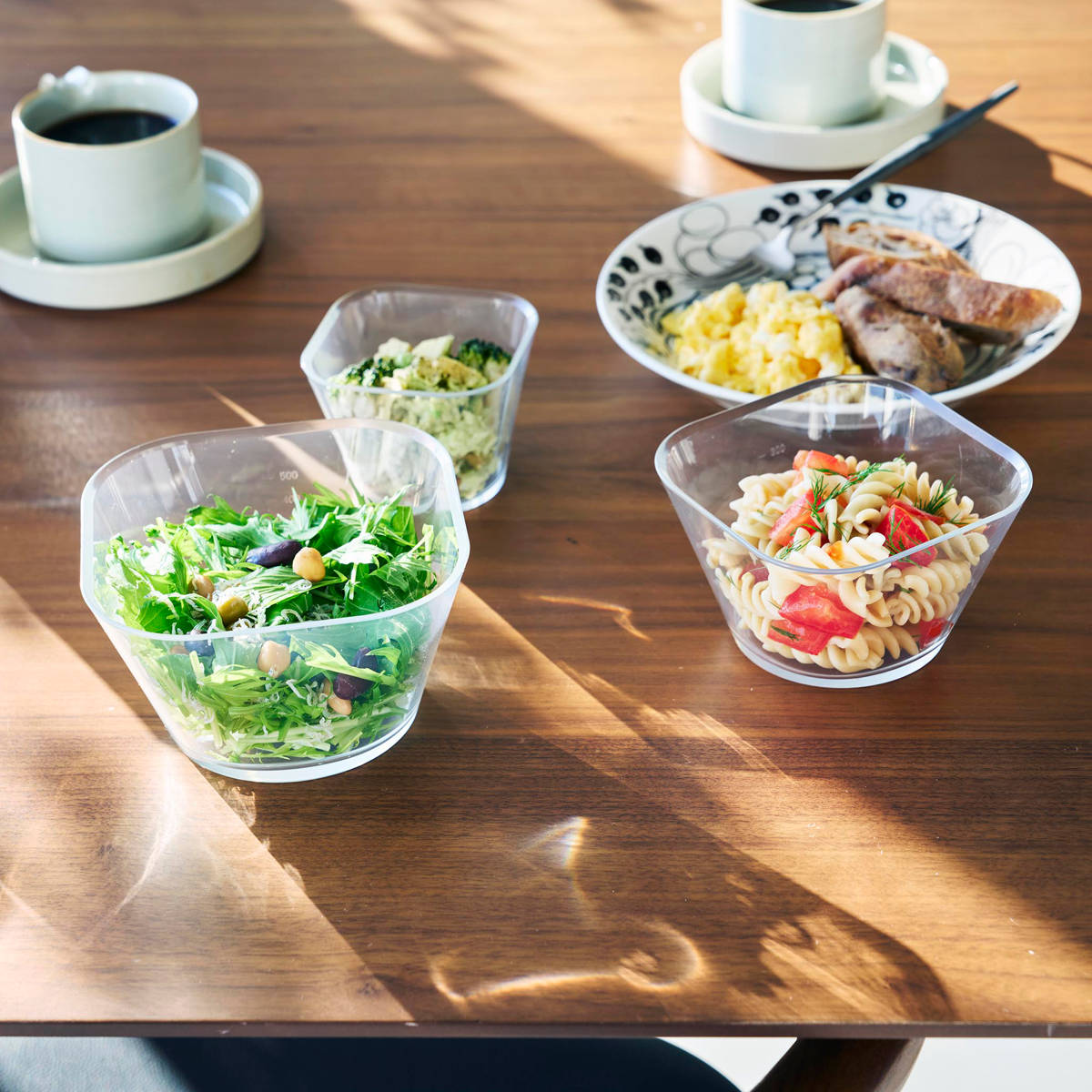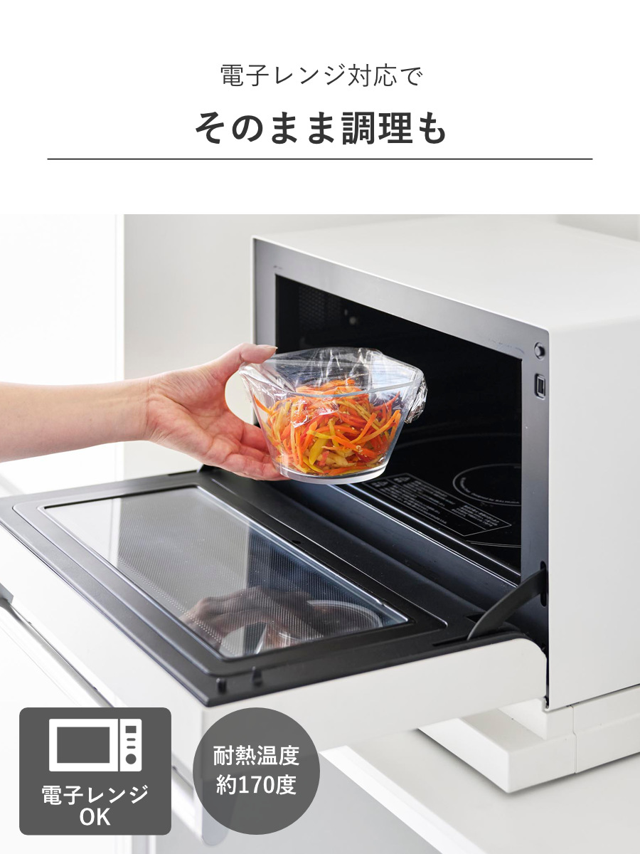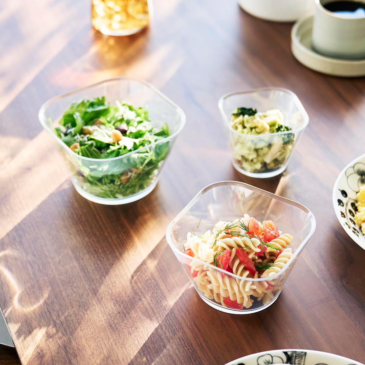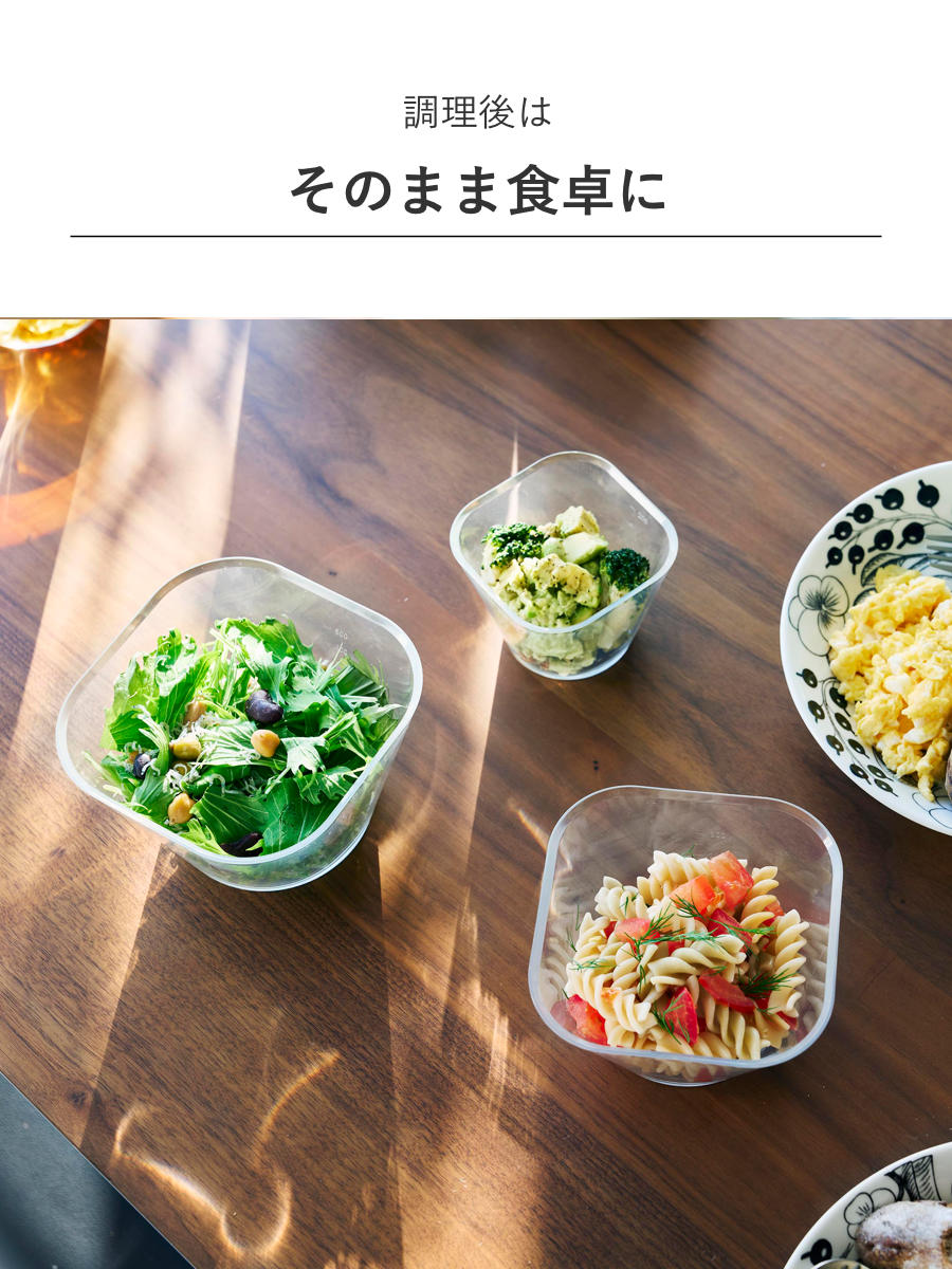 ガラスのような透明感で、食卓にそのまま器としても出せるデザインです。調理をしてから食器として使えるので、洗い物を減らすことができます。